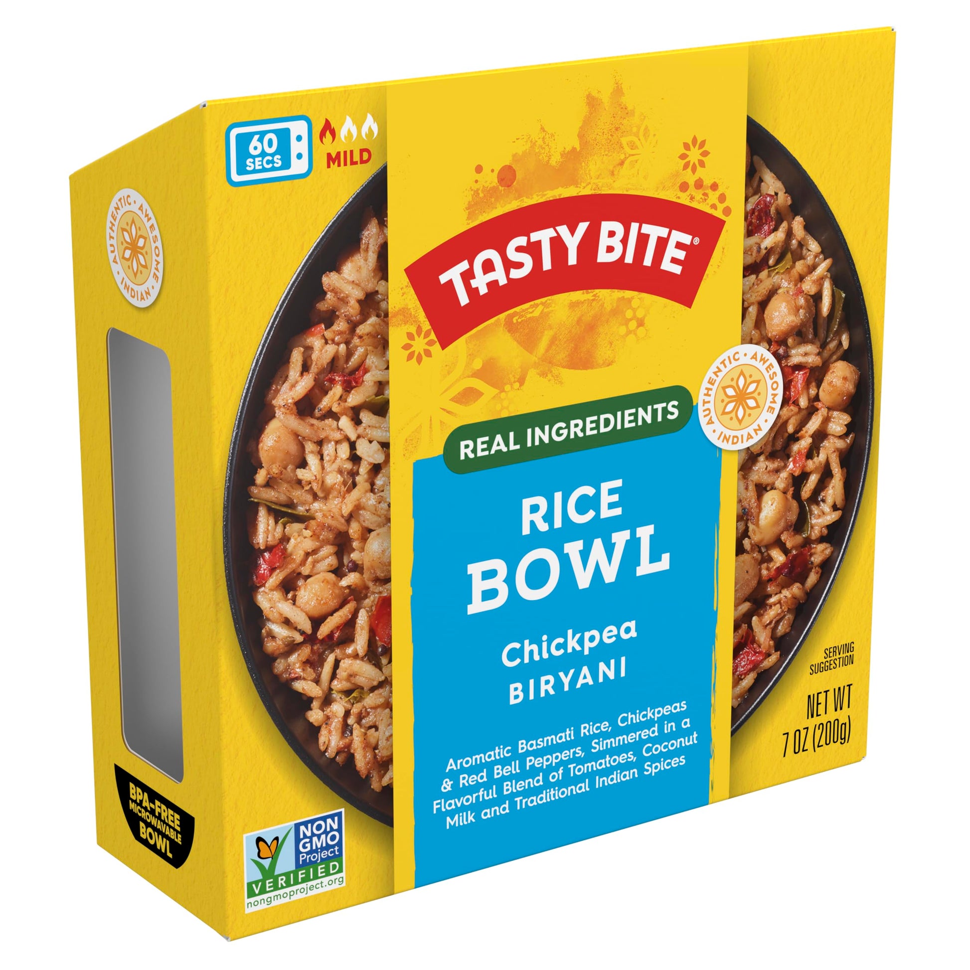 - Q: What are the main ingredients in Tasty Bite Chickpea Biryani Rice Bowl? A: The Tasty Bite Chickpea Biryani Rice Bowl is made with all-natural ingredients, featuring chickpeas, basmati rice, and a blend of authentic Indian spices, ensuring a flavorful and healthy meal. It is also vegan, containing no artificial colors, flavors, or preservatives.