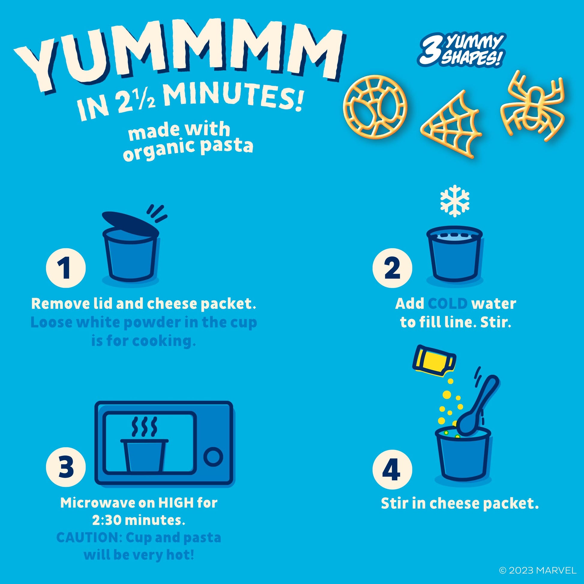 - Q: How do I prepare the Spidey mac and cheese? A: To prepare Annie's Spidey mac and cheese, simply remove the lid and cheese packet, add cold water to the fill line, and microwave on high for about 2 minutes and 30 seconds. After microwaving, stir in the cheese packet, allow to cool slightly, and enjoy!