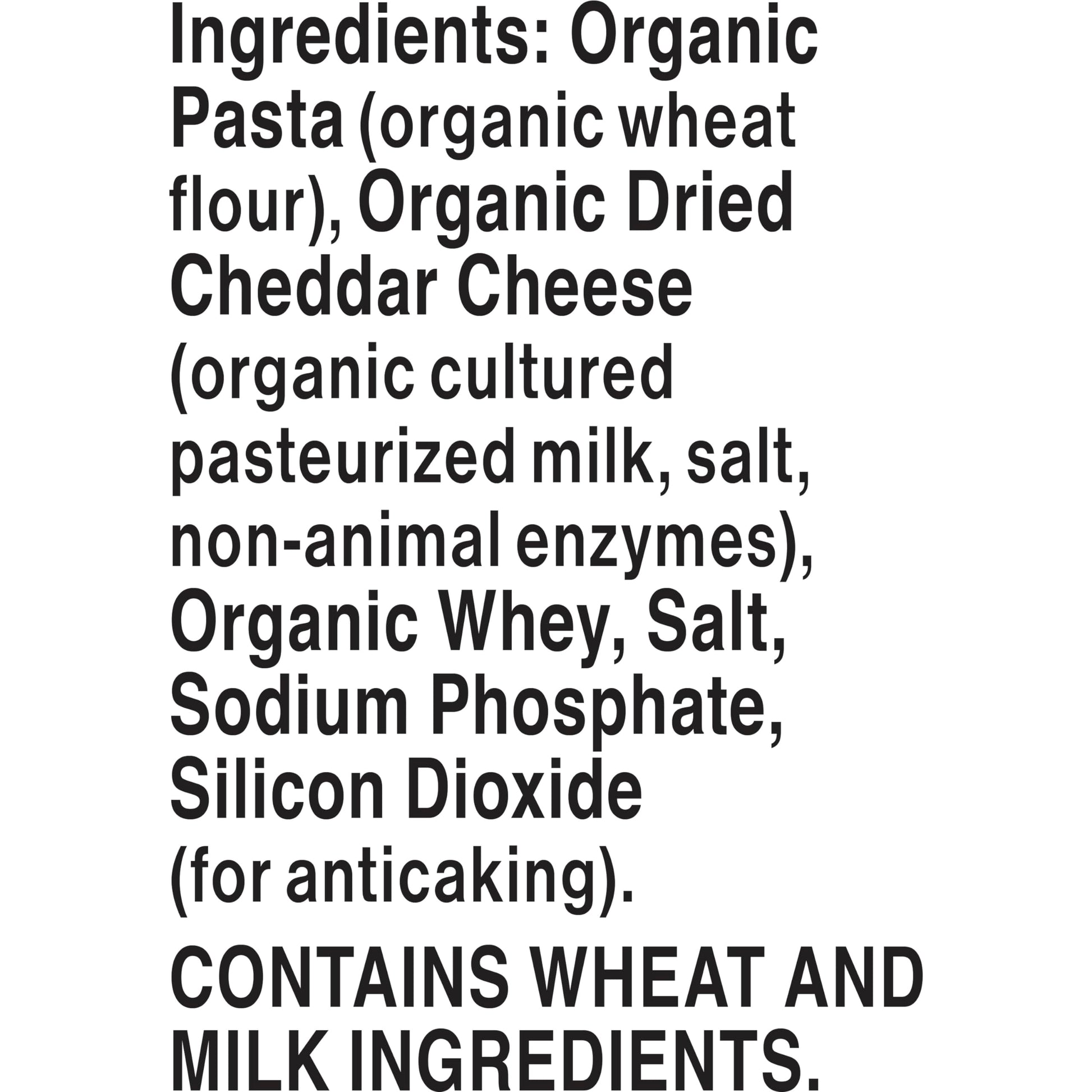 - Q: What are the main ingredients in Annie's Organic Macaroni and Cheese? A: Annie's Organic Macaroni and Cheese is made with organic pasta shells and real aged cheddar cheese sourced from cows raised without antibiotics or synthetic hormones. It also includes non-GMO ingredients and contains 8 grams of whole grain per serving.