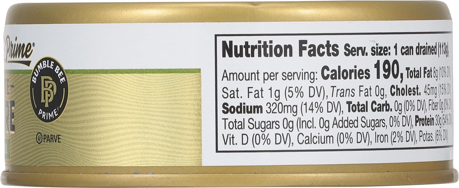 - Q: What are the nutritional benefits of Bumble Bee Prime Tuna? A: Each 5 oz can of Bumble Bee Prime Solid White Albacore Tuna provides 30 grams of protein, making it an excellent choice for those seeking a high-protein snack or meal. It is low in carbohydrates, making it suitable for ketogenic diets, and is also a good source of healthy fats from olive oil.