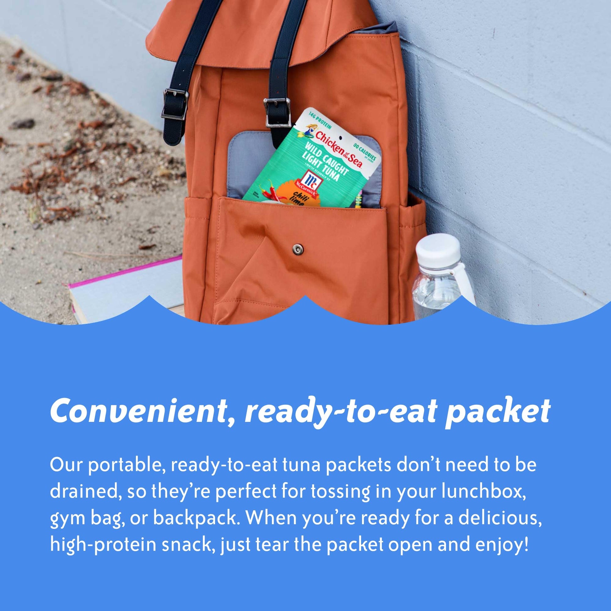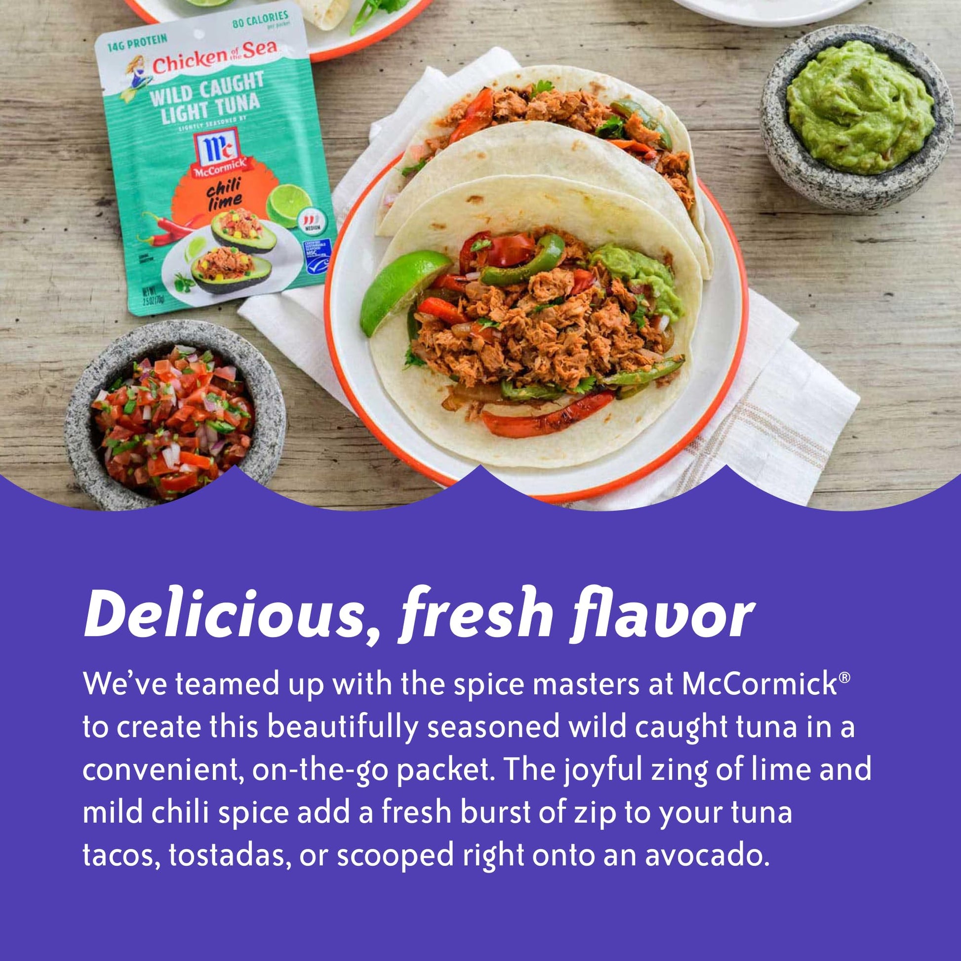 DELICIOUS, FRESH FLAVOR: Weve teamed up with the flavor experts at McCormick to create this beautifully seasoned wild caught tuna in a convenient, on-the-go packet. The joyful zing of lime and mild chili spice add a fresh burst of zip to your tuna tacos, tostadas, or scooped right onto an avocado.HIGHLY NUTRITIOUS: Chicken of the Sea packets are the perfect on-the-go snack for your active, healthy lifestyle. They are high in protein and features heart-healthy omega-3s, plus vitamins and minerals-perfect for keto, paleo, and Mediterranean diets.READY-TO-EAT PACKET: Tuna salad packets require no can opener or draining, so you can just tear them open and go. Perfect for a lively weeknight dinner at home, or take it with you and dig right into the packet anywhere your healthy lifestyle takes you.WILD CAUGHT: Our tuna salad packets contain only Marine Stewardship Council (MSC) certified, 100% skipjack wild tuna. Were doing our part to keep our seas healthy now and for future generations.BULK 12-PACK: Stock up on tuna packets and save! Our convenient, single-serve pouches are easy to store and ready whenever you need them-perfect for a protein-packed snack on the run.