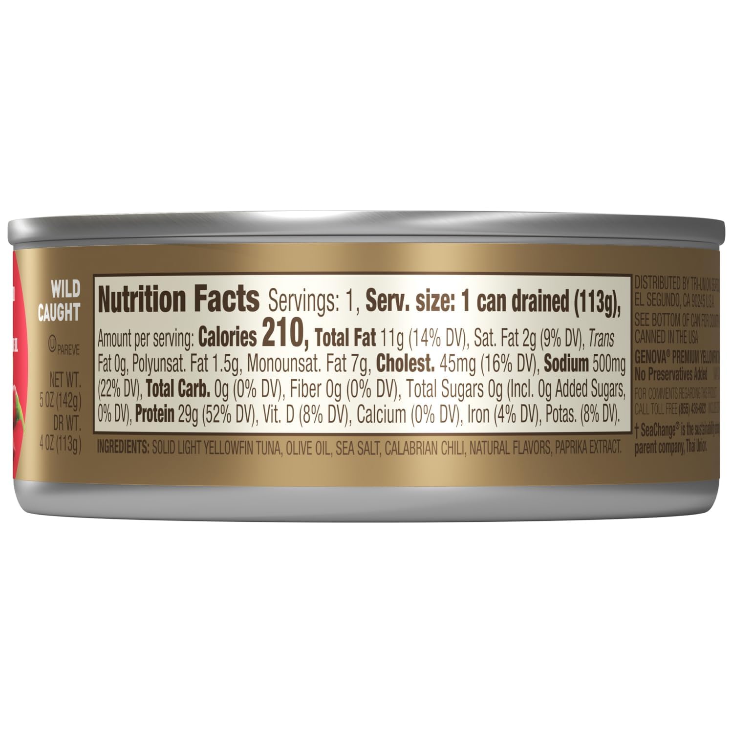 - Q: What makes Genova Premium Yellowfin Tuna different from other canned tunas? A: Genova Premium Yellowfin Tuna stands out due to its incredible flavor, which comes from being packed in Calabrian Chili-infused olive oil. This method not only enhances the taste but also uses the finest cuts of wild caught tuna, ensuring a high-quality product that is both delicious and nutritious.