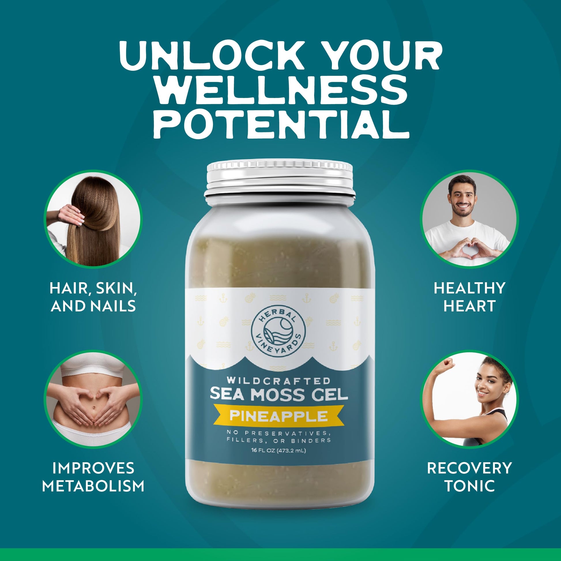 - Q: What are the health benefits of using Herbal Vineyards Irish Pineapple Sea Moss Gel? A: Herbal Vineyards Irish Pineapple Sea Moss Gel is packed with 92 of the 102 essential minerals that your body needs, promoting natural energy, digestive health, and overall wellness. It also supports skin hydration and elasticity, making it beneficial for skincare routines.