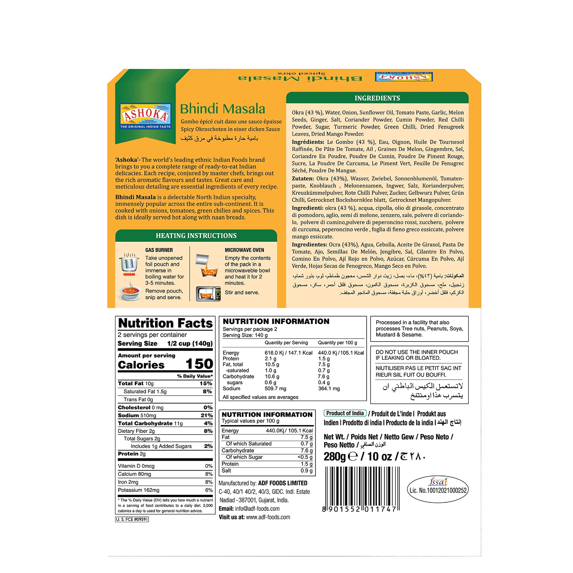 Enjoy a century of food traditions from our family to yours with Ashoka. Bhindi Masala is a traditional Indian delicacy of ladies fingers cooked in aromatic spices. Its vibrant flavor with a spicy touch makes you feel the real taste of India. Specially made for vegans! Why Ashoka:We select the best ingredients and combine them into a masterpiece of Indian cuisine. But wait, mixing different ingredients is not a difficult task and any other person can do it. So, what makes us special?We have a strong relationship with food going back to the 1930s. Our experience allows us to understand the customers needs and provide them with what they are expecting. Consistency is what makes us different from others. Every bag has the same taste and the same texture. 4 Hs of Flavorful Journey:Each of our products is a result of the basic questions that make our core.How to make it best?How to source the choicest ingredients?How to get the flavors just right - and the most importantHow to get it into the kitchens of people like you, who love food just as much as we do? Instant Food in No Time:With Ashoka, you can have your meals ready in just 2 minutes. Whether you are on the go or on a picnic, this healthy food is ready to be with you. And preparing it is as easy as it sounds. Just empty the content in the bowl and microwave it for 2 minutes or immerse the unopened food foil in boiling water for 3-5 minutes and your favorite meal is ready. Give Every Meal your Signature Touch:Heat and serve or turn it into something extra special. Simmer it with your favorite sauce, or enjoy with some rice, the options are unlimited.