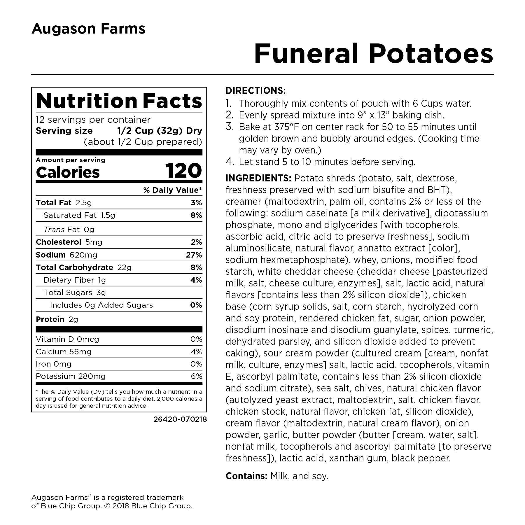 The Augason Farms Funeral Potatoes traditional casserole has become a pleasing favorite at funeral luncheons, church gatherings, family dinners and holiday meals. All the essential ingredients to create a hearty, classic dish are right here in one convenient package. Make it your own by garnishing with corn flakes, breadcrumbs, bacon, jalapenos and more. This pouch will make a casserole dish that's 9" x 13".With Augason Farms Funeral Potatoes in your pantry, you’ll get the delicious goodness you love in one easy-to-prepare recipe. These potatoes are so delicious that you'll be dying for more! Augason Farms recognizes that today's consumers are more concerned than ever before about what kind of foods they eat, and want to provide their families with food that is safe and the best quality. Family owned and operated since 1972, Augason Farms believes that great taste is a tradition worth preserving. Crafted with a focus on taste and nutrition, their products are manufactured in-house to the highest possible standards.