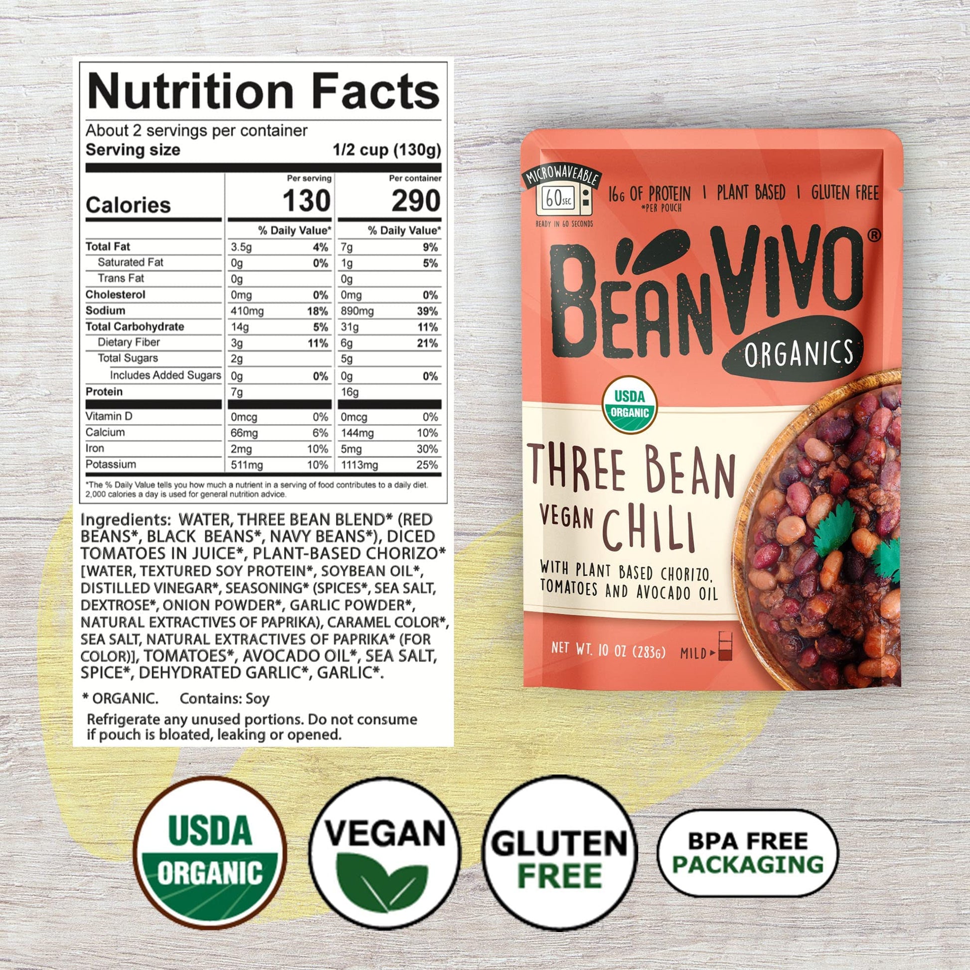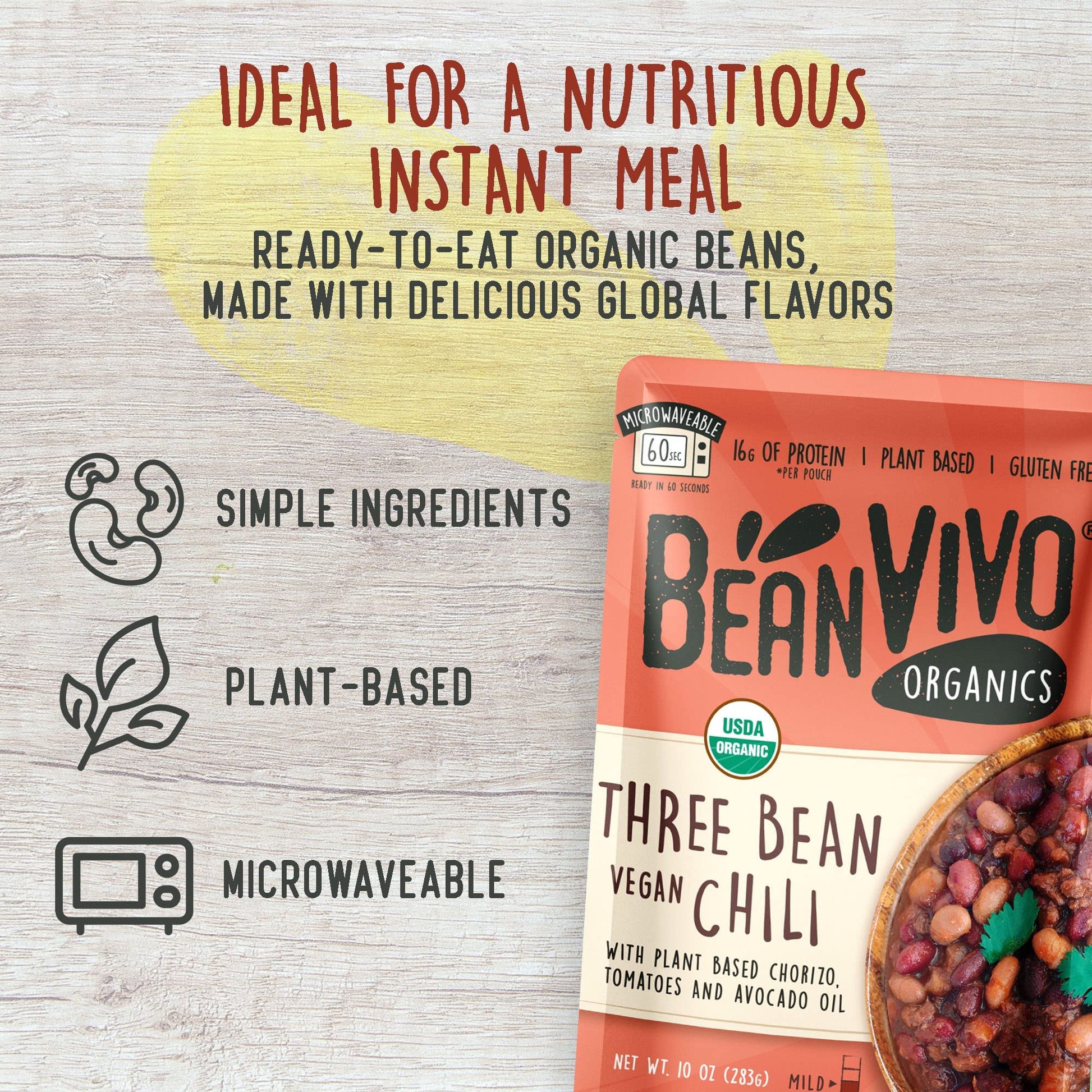 Hungry For Delicious Food But Donat Have The Time To Cook Experience Hearty, Fiery Meals With Beanvivoas Vegan Three Bean Chili These Nutritious, Instant Beans In A Pouch Make A Super Flavorful Dip, Spread, Or Stand-Alone Meal You Can Enjoy On The Go.&Nbspinstant Nutritious Mealpower Through Your Day With Enough Energy And Nutrition. Our Chili Beans Are Packed With Calcium, Potassium, Iron, Fiber, And Nutritive Fats From Avocado Oil For Quick, Great-Tasting, And Filling Dishes.Discover A Wide Range Of Meal Ideaswith Our Bean Packs, You Can Create Cozy, Warm Dishes That Are Very Tasty And Nutritious. Some Recipe Ideas You Can Create With Our Packs Include:Spreads For Your Molletes, Tacos, And Baked Potatoesside Dishes For Eggs And Pastarice And Beans Recipesa Hearty Soup With Warm Bread, And Many Morea Delectable Spicy Dish In Secondsthis Three-Bean Vegan Chili Pack Is Ready To Eat. You Can Also Heat It Quickly On Your Stove Or In The Microwave Oven For 60 Seconds. A Pack Of These Nutritious Beans Is Good For 2 Servings.Ethically Sourced And Earth-Friendlywe Stay True To Our Commitment To Provide You With Naturally Grown And Sourced Beans While Reducing Our Carbon Footprint. Thatas Why We Only Partner With Local Suppliers Across The United States Who Practice Responsible, Organic Farming.&Nbsp4 Delicious Beanvivo Seasoned Legumesrefried Pinto Beanscoconut Curry Chickpeasbaja Black Beansthree Bean Vegan Chilienjoy Abeana Alive With Beanvivo Organics. Try Our Ready-To-Eat Three Bean Vegan Chili Today