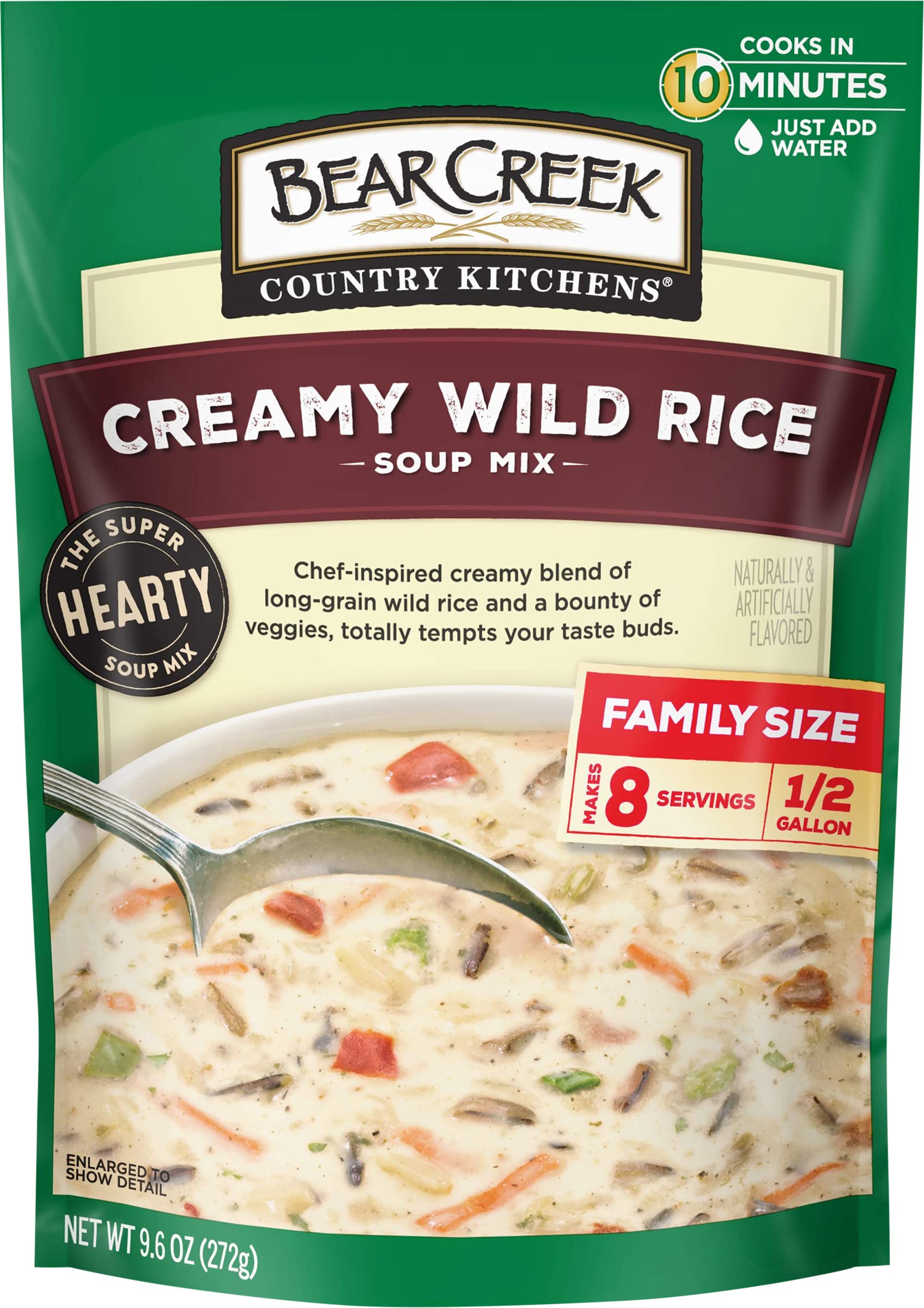 - Q: What is the serving size for Bear Creek Soup Mix, Creamy Wild Rice? A: The Bear Creek Soup Mix, Creamy Wild Rice comes in a 9.6-ounce package, which typically serves about 8 servings, making it a great option for family meals or gatherings.