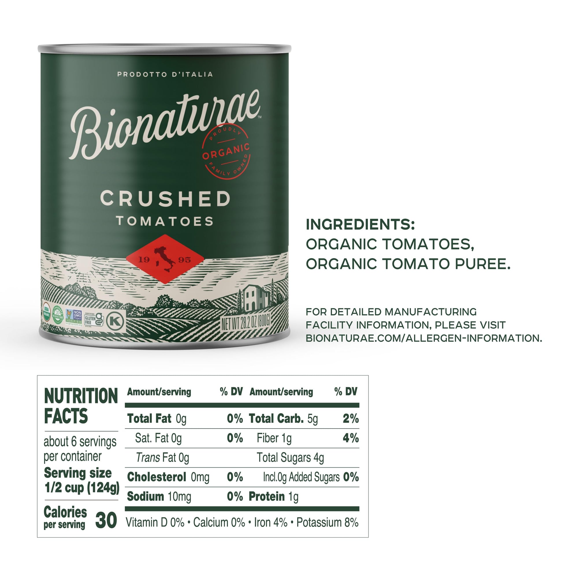 Q: What is the packaging size of Bionaturae Organic Crushed Tomatoes?A: Bionaturae Organic Crushed Tomatoes come in a 28.2 oz can, which is convenient for various cooking purposes and can easily be stored in your pantry.