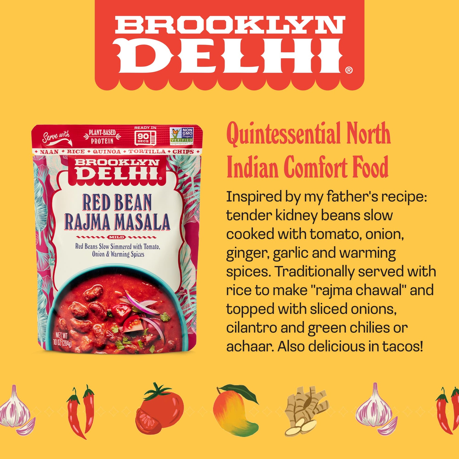 Q: What is the serving size and nutritional information?A: Each pouch of Brooklyn Delhi Red Bean Rajma Masala is 10 ounces and offers a nutritious serving packed with 7g of protein per serving, making it a satisfying choice for meals.