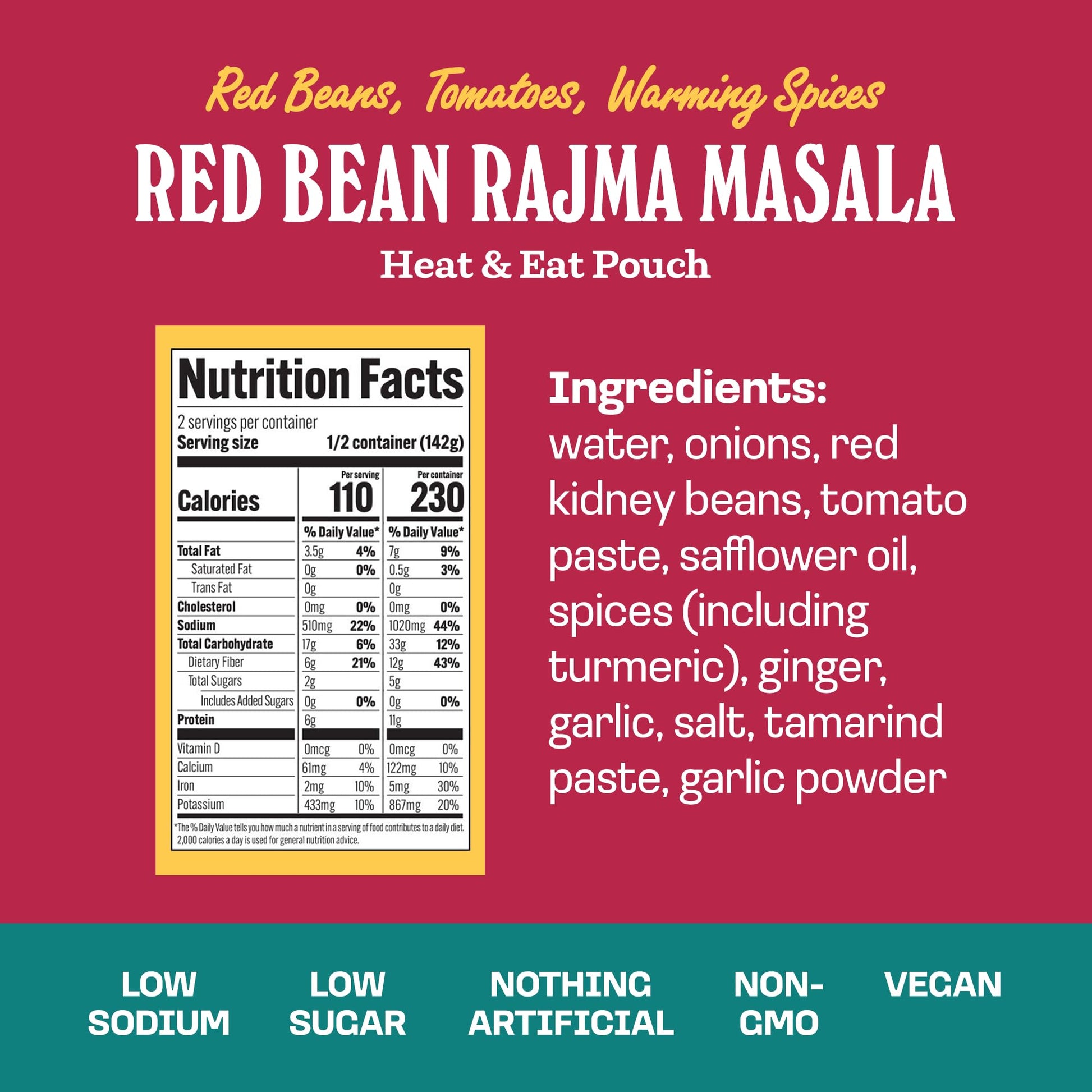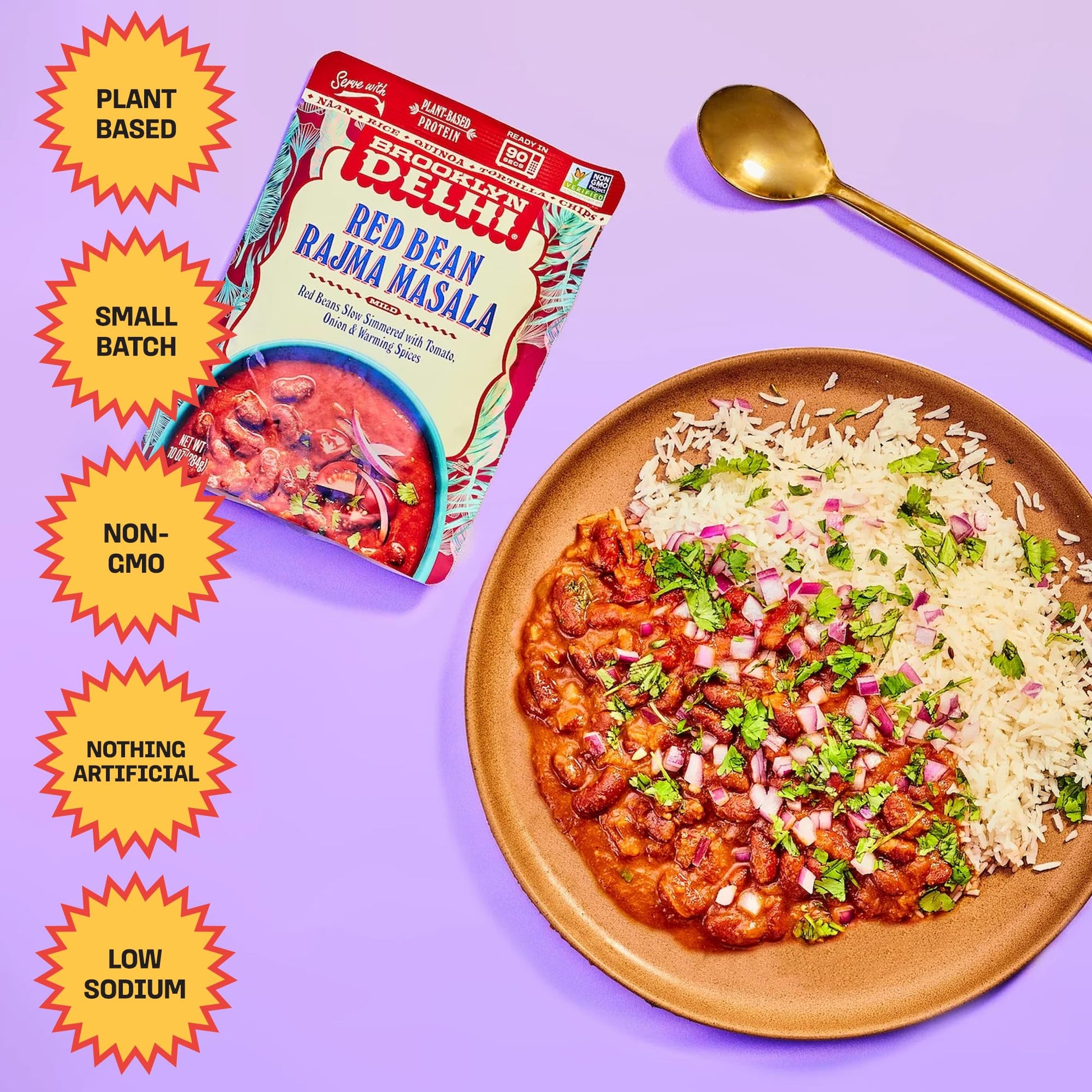 Q: What are the main ingredients in Brooklyn Delhi Red Bean Rajma Masala?A: Brooklyn Delhi Red Bean Rajma Masala is made with wholesome ingredients including red beans, spices, and a blend of coconut cream, turmeric, and cumin. This vegan and non-GMO meal is crafted without artificial ingredients or stabilizers.