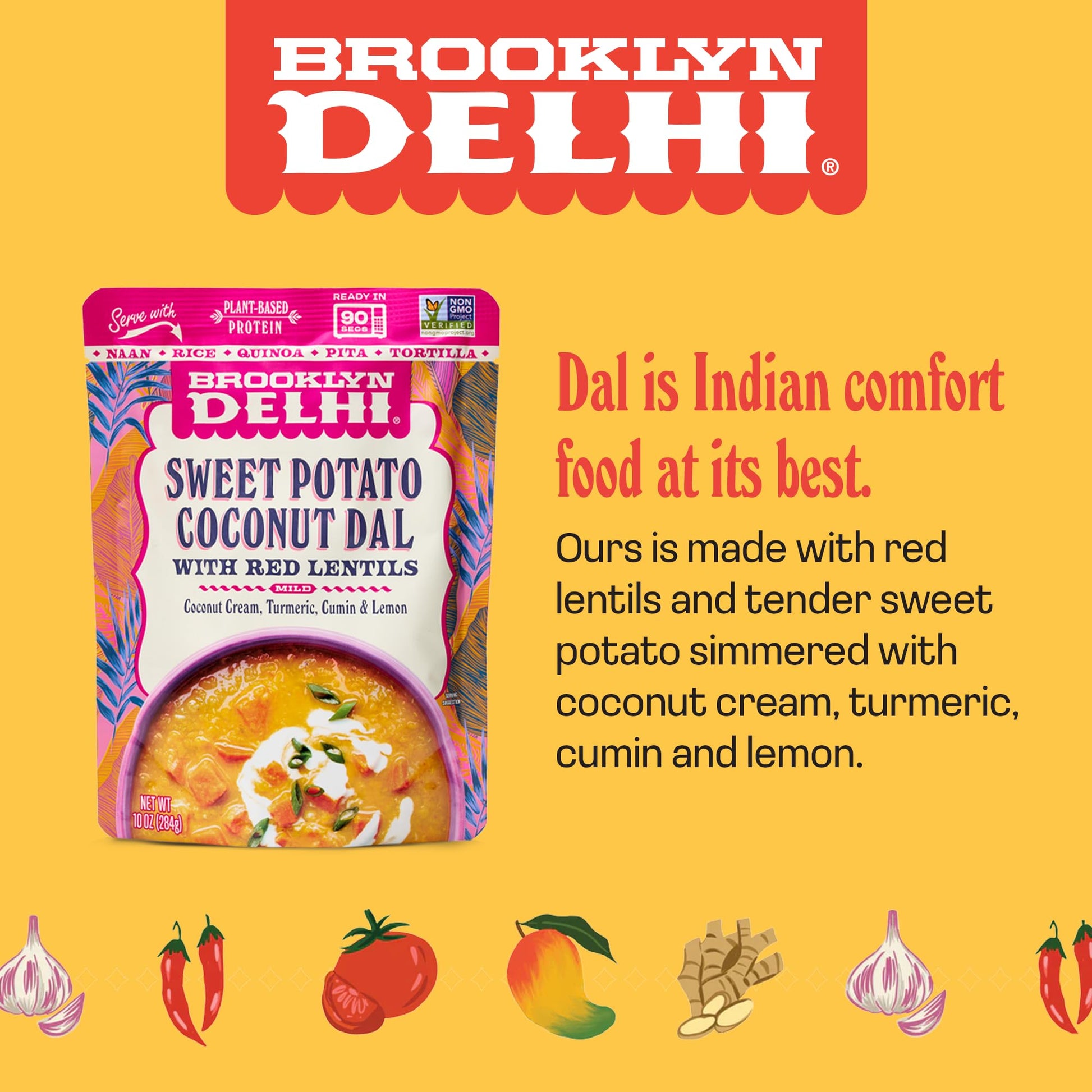 Q: What are the main ingredients in the Brooklyn Delhi Variety Pack Pouches?A: The Brooklyn Delhi Variety Pack includes a blend of wholesome ingredients such as red lentils, sweet potatoes, coconut cream, turmeric, cumin, and lemon, ensuring a nutritious and delicious meal.
