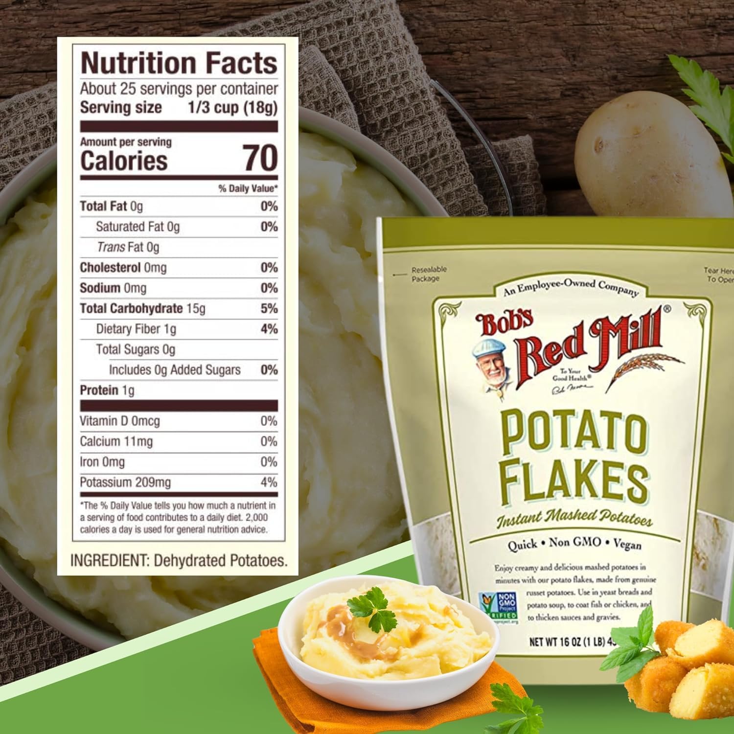 Mashed Potatoes Are Indeed The Perfect Sides, Create Creamy Instant Mashed Potatoes With This Creamy Potato Flakes Bundle.! This Bundle Is For One-16 Oz Resealable Bags Of Bobs Red Mill Potato Flakes Instant Mashed Potatoes Plus , Creamy Potato Flakes Bundle. Includes One-16 Oz Resealable Bag Of Bobs Red Mill Potato Flakes Instant Mashed Potatoes + Createandbundle Stickerbob'S Red Mill Potato Flakes Are Made From Genuine Organic Russet Potatoes. In Just Minutes You Can Enjoy Hot And Delicious Real Mashed Potatoes That Taste Just Like Homemade. It'S Simple: Just Add Our Potato Flakes To Hot Water, Gently Fluff With A Fork, And Serve. The ''Can'T Fail'' Recipe Is On The Label. Our Potato Flakes Are Perfect As A Quick Side Dish Or Snack, But There Are Many Other Ways To Put These Spuds To Use. Bob'S Red Mill Potato Flakes Are Outstanding In Yeast Breads That Call For Mashed Potatoes. They Produce A Soft Velvety Texture In Potato Bread Loaves And Rolls. Potato Flakes Are Also And Excellent Base For Creamy Potato Soup. Give Fried Fish, Chicken Or Pork Chops A Crispy Coating By Dipping In An Egg Wash, Then Dredging In Potato Flakes Before Baking Or Lightly Frying. You Can Also Add Potato Flakes To Meatloaf Or Meatballs To Create A Smooth, Even Texture. Last But Not Least, Potato Flakes Are A Great Way To Thicken Sauces And Gravies. Bobs Red Mill Potato Flakes Are Manufactured In A Dedicated Gluten Free Facility; R5-Elisa Tested Gluten Free. Also Non-Gmo, Vegan, Vegetarian, Paleo Friendly & Kosher Pareve! Just Like Bobs Red Mill Rye Flour, Organic Potato Flour, Bobs Red Mill Oatmeal, Bobs Red Mill Baking Soda And Other Bobs Red Mill Products!