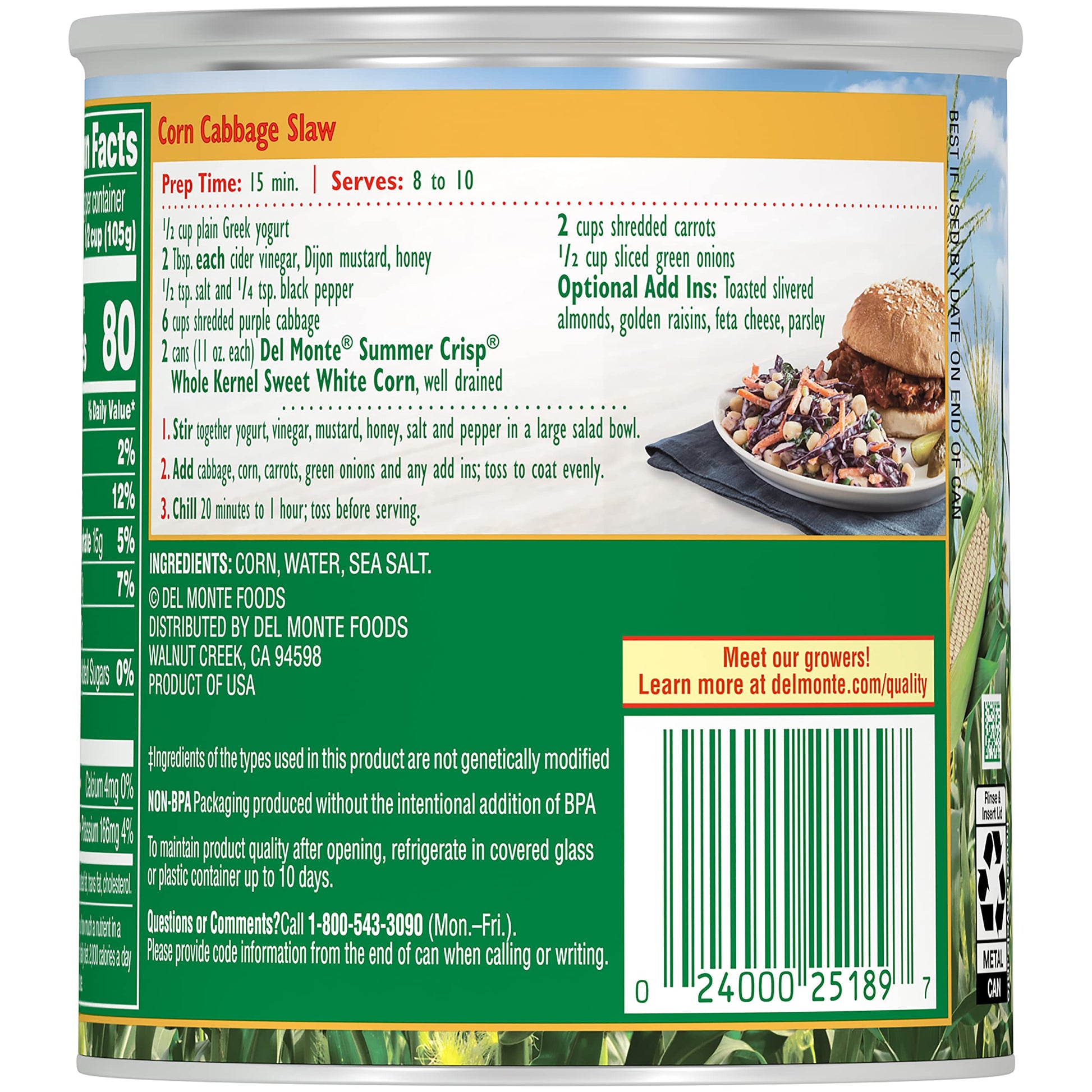 Del Monte Summer Crisp White Corn is picked and packed at the peak of freshness for a rich, sweet flavor. Our crisp corn contains just three simple ingredients - non-GMO corn, water, and a dash of sea salt. Our corn works not only as a delicious side, but also as a stand-alone ingredient. Del Monte works hard to cultivate the freshest, most nutritious fruits and vegetable to use in every one of our products. When you trust Del Monte, you can be sure what you re buying is the peak of quality and nutrition!