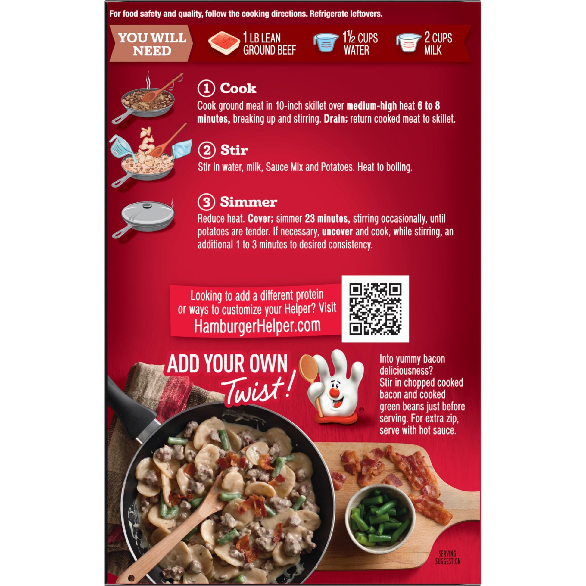 Potatoes Stroganoff Hamburger Helper is made with REAL herbs and spices for the flavors you love most. Add Your Own Twist! Into yummy bacon deliciousness? Stir in chopped cooked bacon and cooked green beans just before serving. For extra zip, serve with hot sauce.