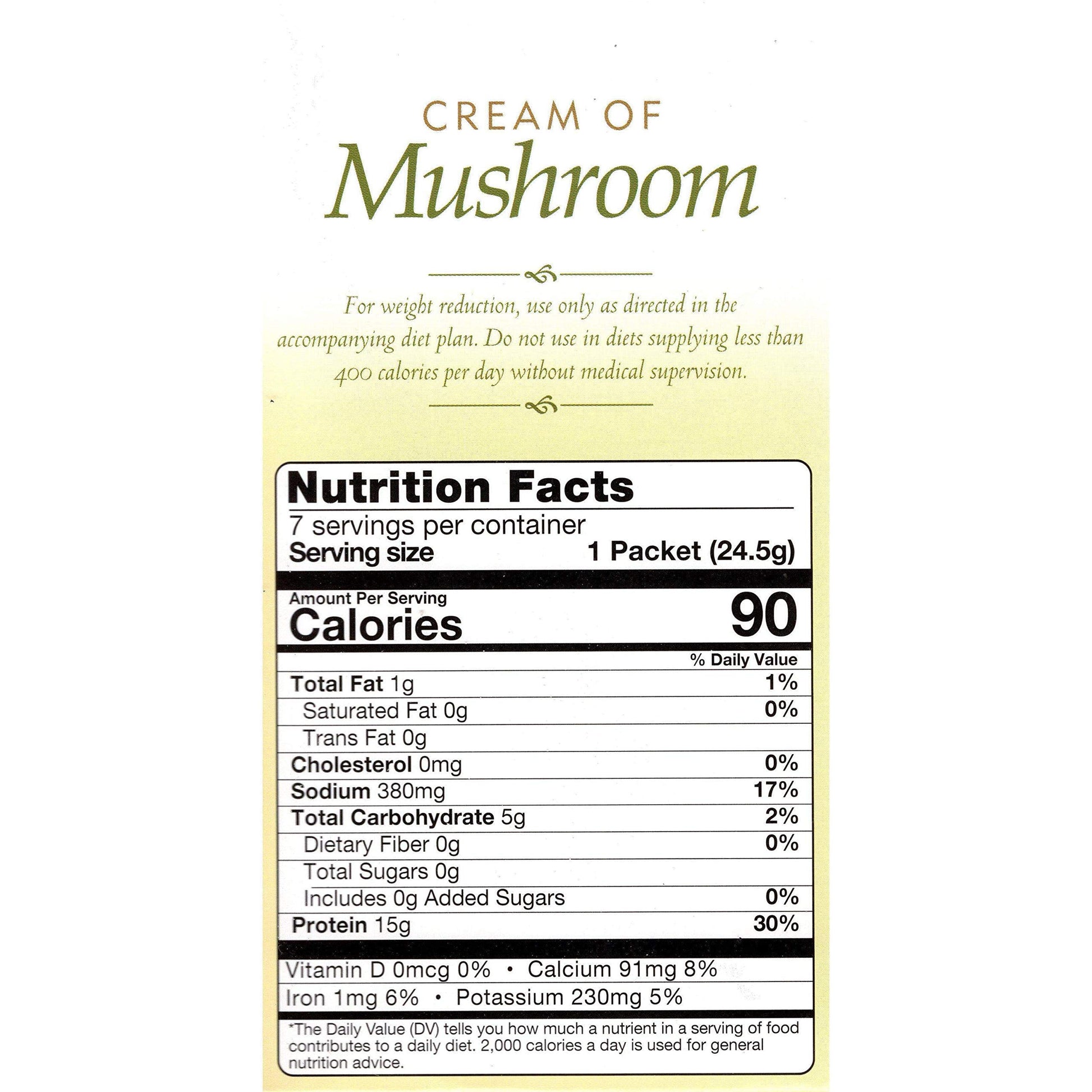 - Q: What are the main nutritional benefits of HealthSmart High Protein Cream of Mushroom Soup? A: HealthSmart High Protein Cream of Mushroom Soup offers 15 grams of high-quality protein per serving, making it a nutritious choice for those looking to increase their protein intake. With only 90 calories, 1g of fat, and 5g of carbs per serving, it's ideal for low-calorie, low-fat diets, including KETO and Ideal Protein plans.