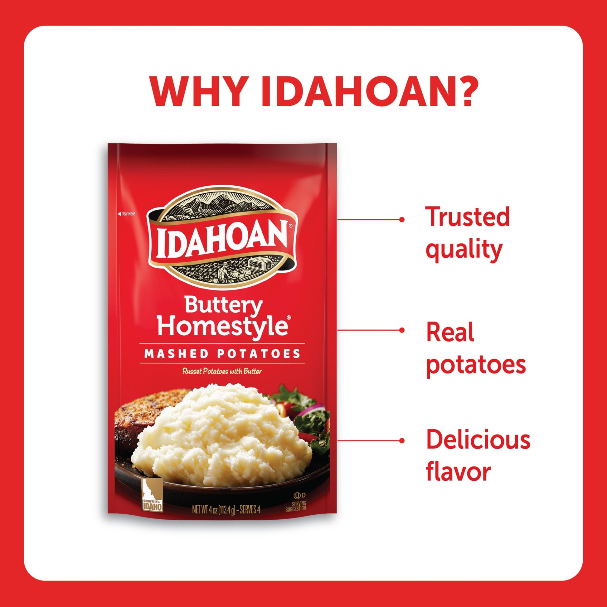 - Q: How do I prepare Idahoan Buttery Homestyle Mashed Potatoes? A: To prepare Idahoan Buttery Homestyle Mashed Potatoes, simply heat water on the stovetop or in the microwave, then add the entire 4 oz pouch of mashed potatoes. Stir well, and your creamy mashed potatoes will be ready in minutes!