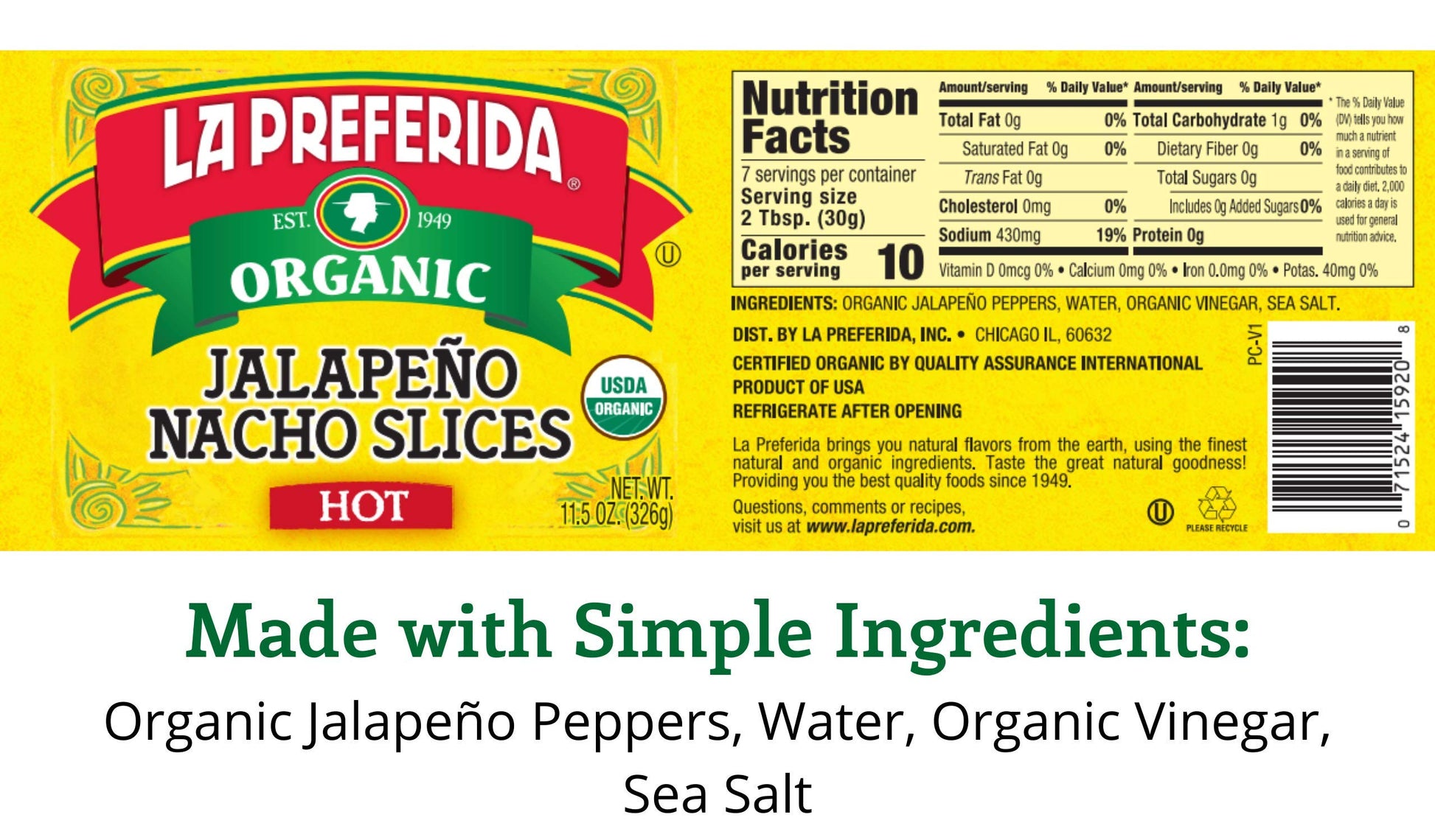 - Q: What are La Preferida Organic Hot Jalapeno Nacho Slices made of? A: La Preferida Organic Hot Jalapeno Nacho Slices are made from high-quality organic jalapenos, ensuring an authentic and flavorful addition to your meals.