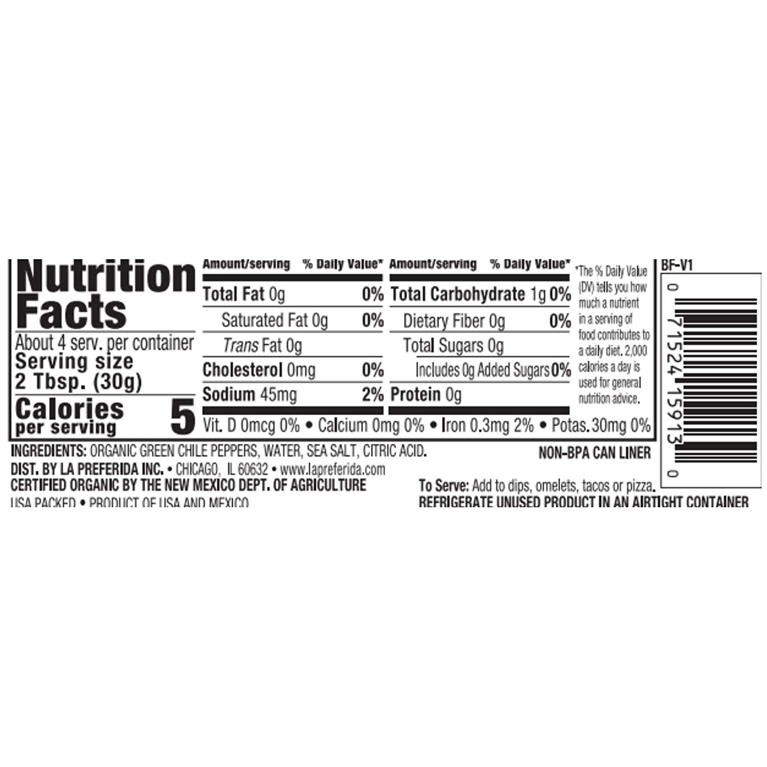 - Q: How should I store the diced green chiles after opening? A: After opening, it's best to store the La Preferida Organic Green Chiles in an airtight container in the refrigerator. They can be kept fresh for up to a week, ensuring you can enjoy their flavor in multiple meals.