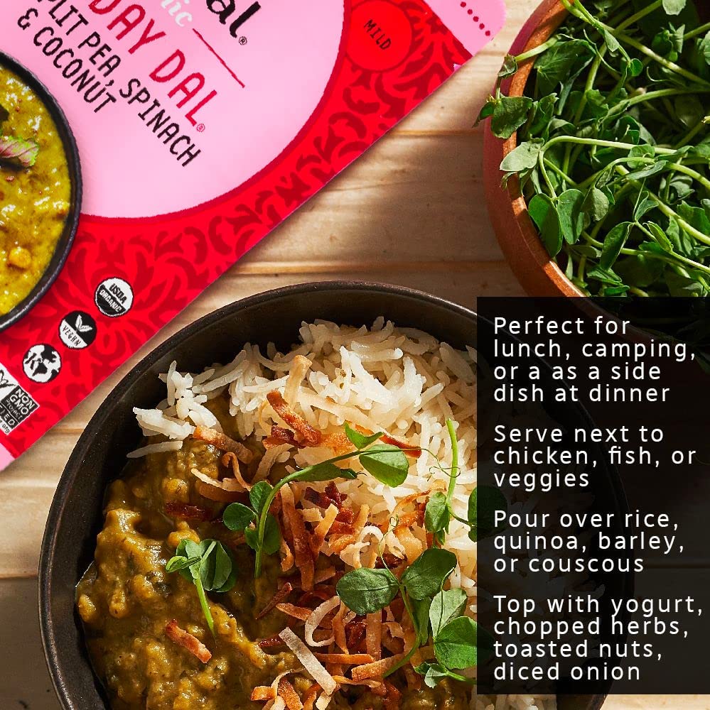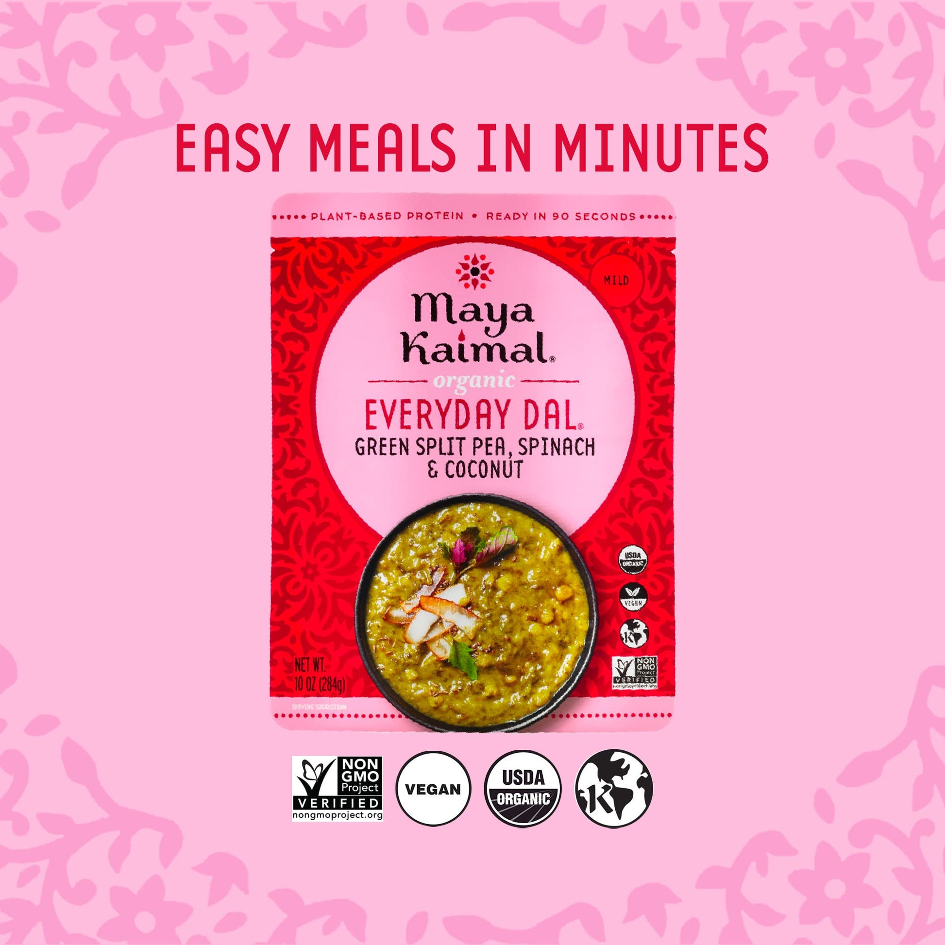 Q: What is Maya Kaimal's Green Split Pea Everyday Dal made from?A: Maya Kaimal's Green Split Pea Everyday Dal is made from organic green split peas, coconut, spinach, and mustard seeds, all inspired by traditional South Indian recipes.