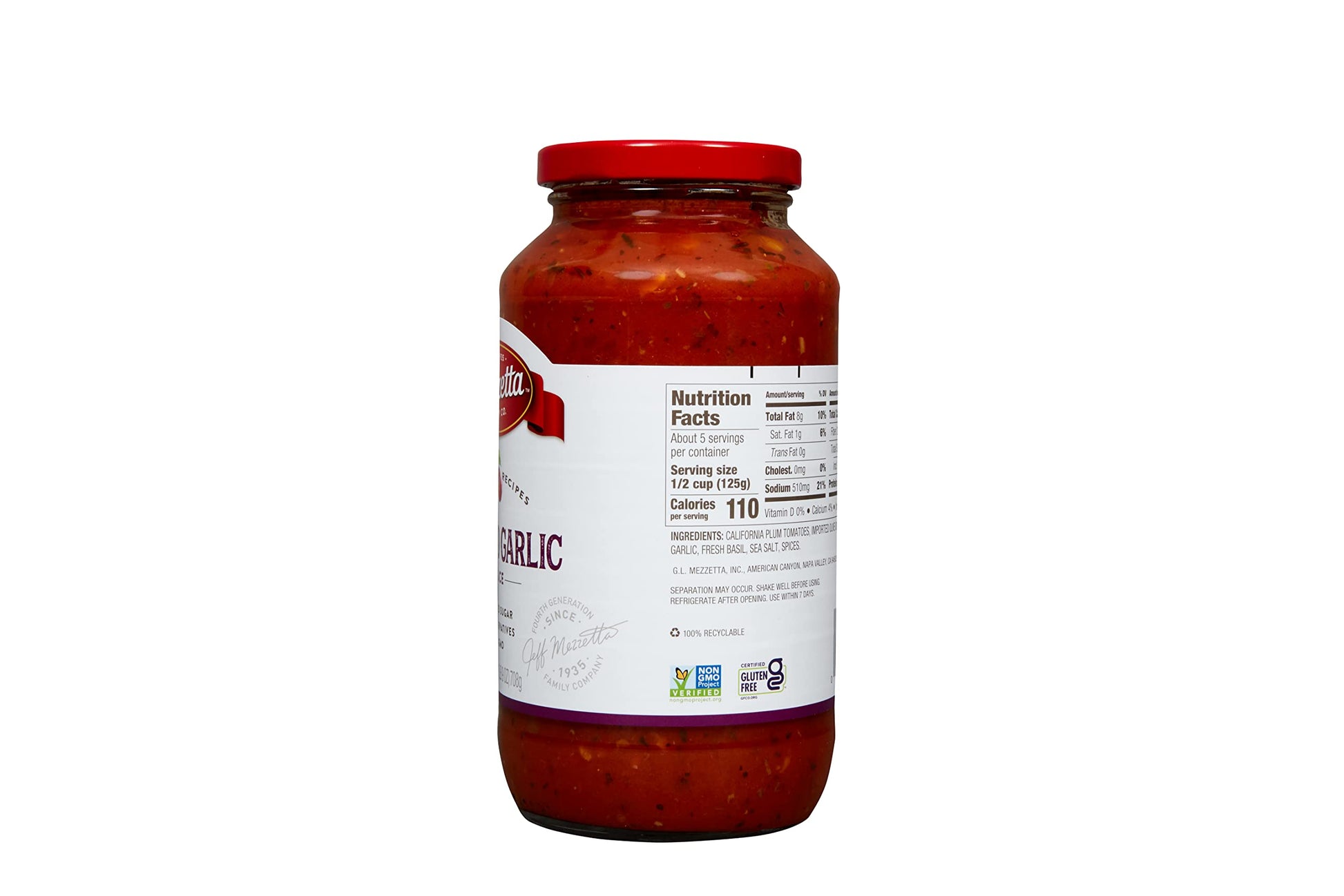Savory Roasted Garlic Sauce: Our Garlic Pasta Sauce Is Made From Sweet Plum Tomatoes, Fresh Onions And Roasted Garlic, Slowly Simmered Together; (2) 25-Ounce Glass Jars | Fresh Garlic Is The Star In This Family Recipe Italian Pasta Sauce With Ingredients From Local California Farms Slow Cooked And Ready To Serve On Your Pasta, Chicken Parmesan And Lasagna | We Care About What You Eat: We Proudly Use Quality Ingredients In Our Pasta Sauces That Are Non-Gmo Project Verified And Gluten Free With No Preservatives, No Added Sugar And Certified Vegan | Our Purpose: Mezzetta Selects The Finest Ingredients The World Has To Offer, To Inspire More People To Add A Little More Happiness In Their Life Through Food; Because When You Share Food, You'Re Sharing Part Of Who You Are | Four Generations In The Making: Mezzetta Is A Family-Owned Company 85 Years In The Making And We'Re On A Mission - To Bring A Little Happiness To Everyday Life Through Handed-Down Recipes And Unforgettable Flavors