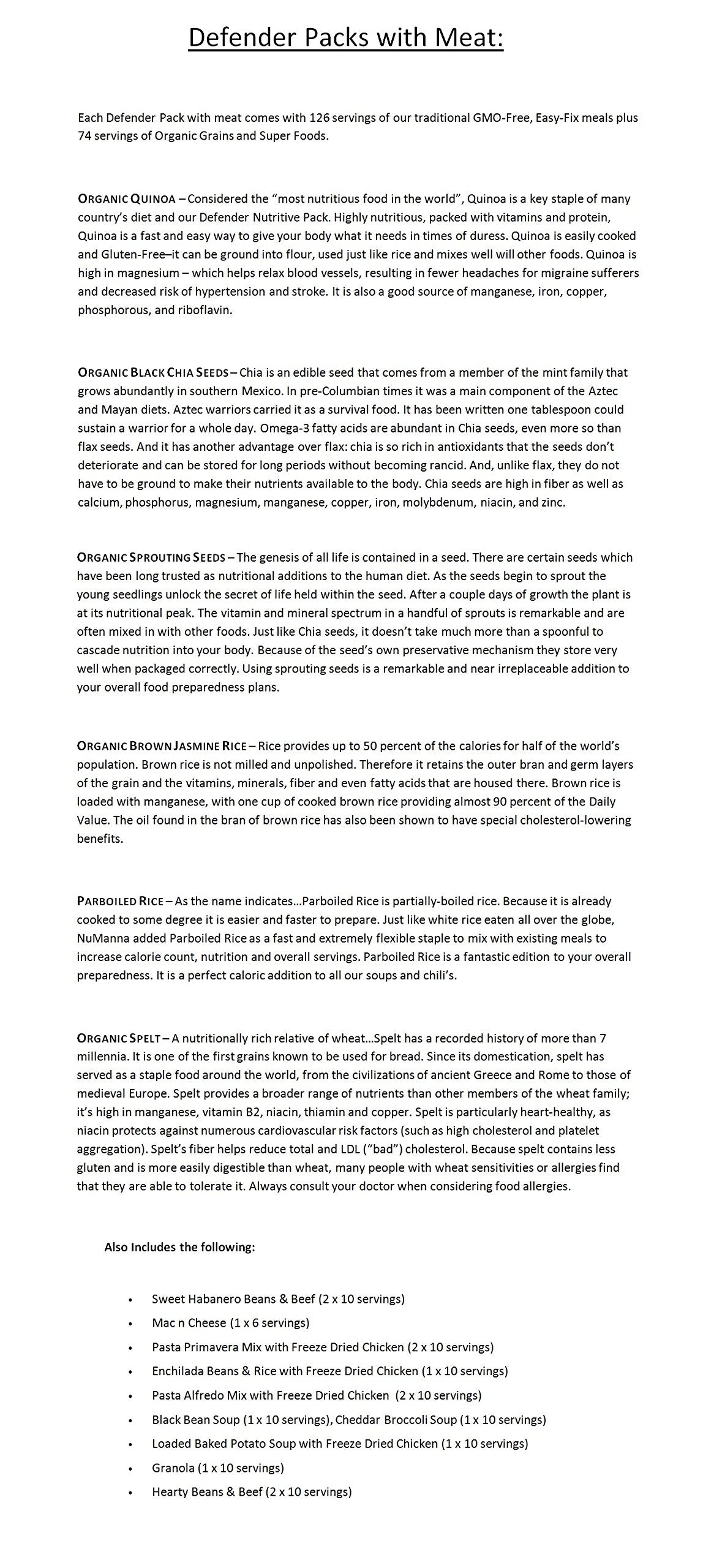 Q: What are the dietary considerations for the NuManna Defender Pack?A: The NuManna Defender Pack is soy-free, gluten-free, and contains no MSG, aspartame, or high fructose corn syrup, making it suitable for a variety of dietary needs.
