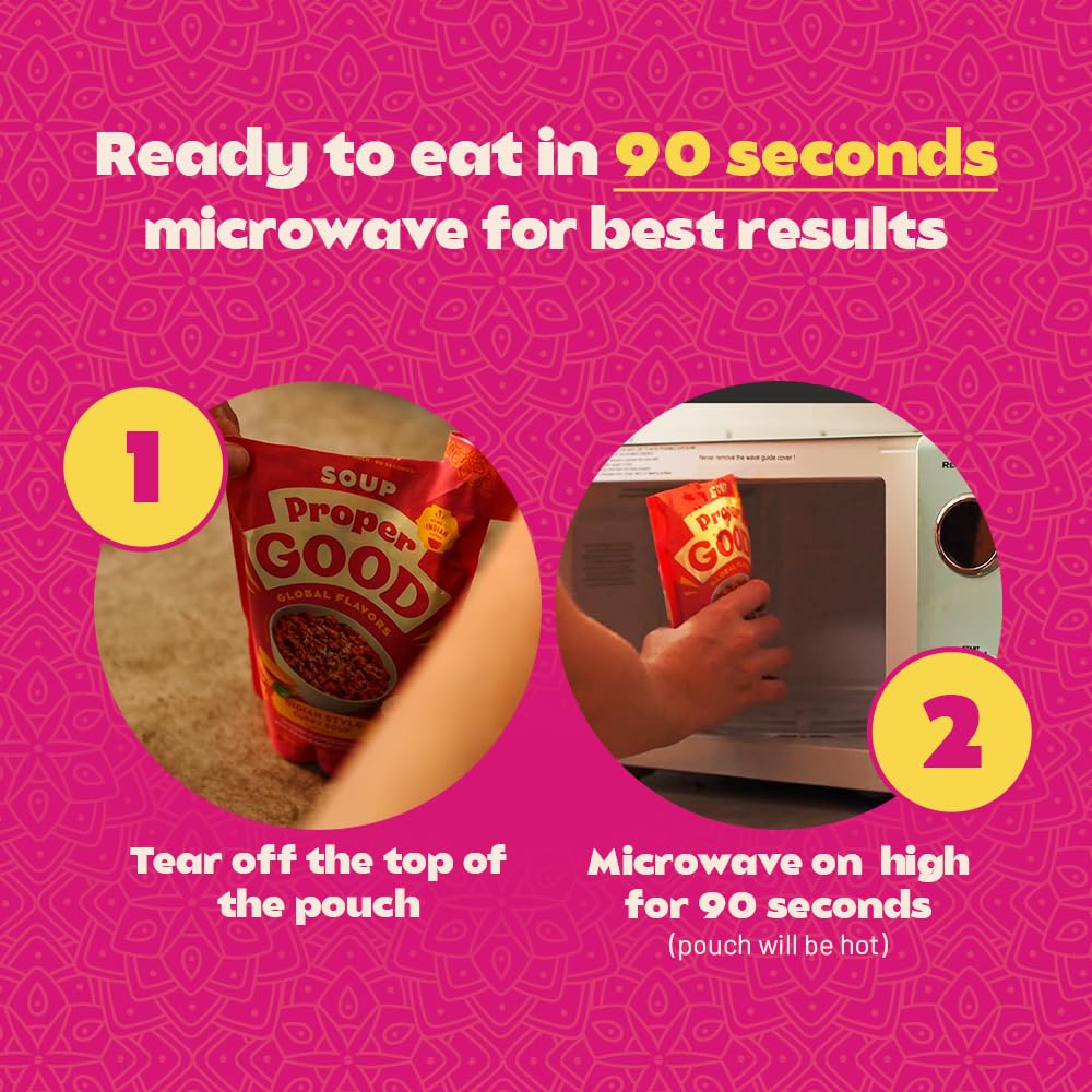 Q: How long does it take to prepare Proper Good Chana Masala Curry Soup?A: The Proper Good Chana Masala Curry Soup is ready to eat in just 90 seconds when microwaved, making it an ideal option for busy individuals looking for a quick meal.