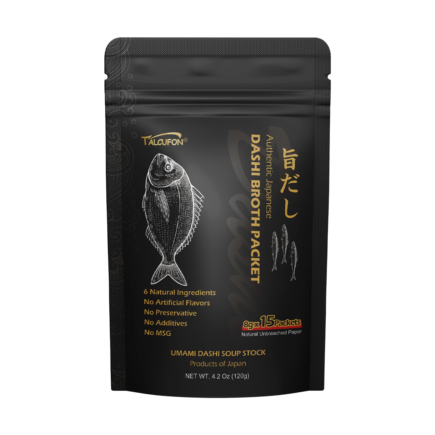 - Q: What are the main ingredients in TALCUFON Dashi Stock? A: TALCUFON Dashi Stock is made from six carefully selected natural ingredients: Kagoshima bonito flakes, dried sardines, dried mackerel, Nagasaki grilled flying fish, kombu kelp, and shiitake mushrooms. These ingredients are expertly blended to create a rich umami flavor.