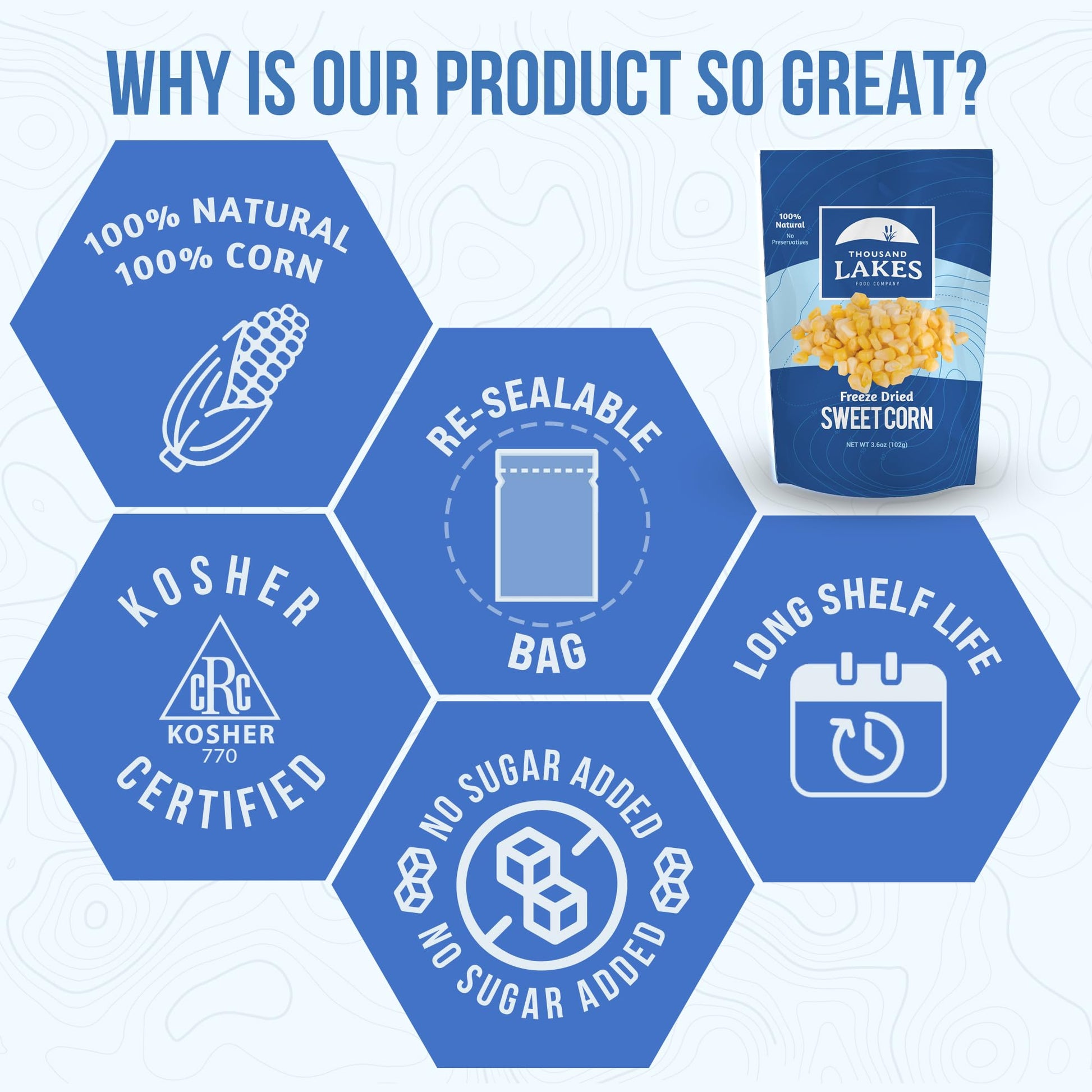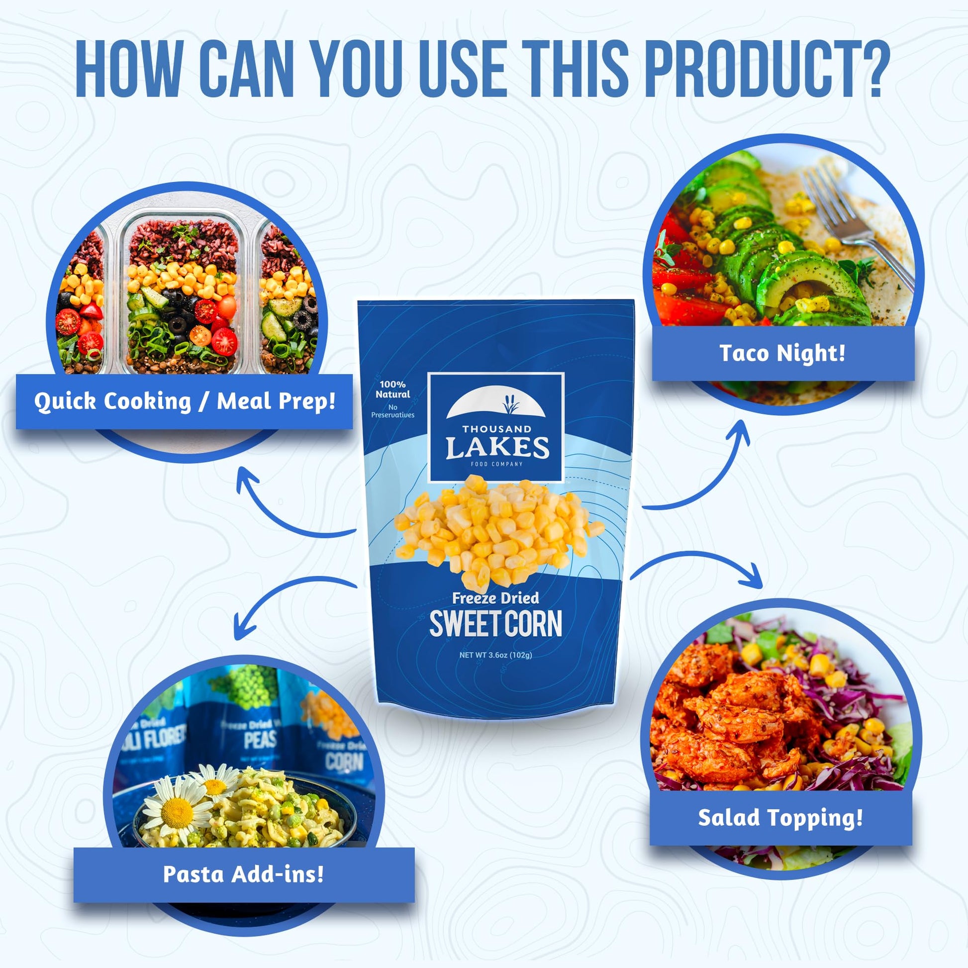 - Q: Are there bulk sizes available for Thousand Lakes Freeze Dried Sweet Corn? A: Yes, bulk sizes of Thousand Lakes Freeze Dried Sweet Corn are available. Check our other listings for more options.