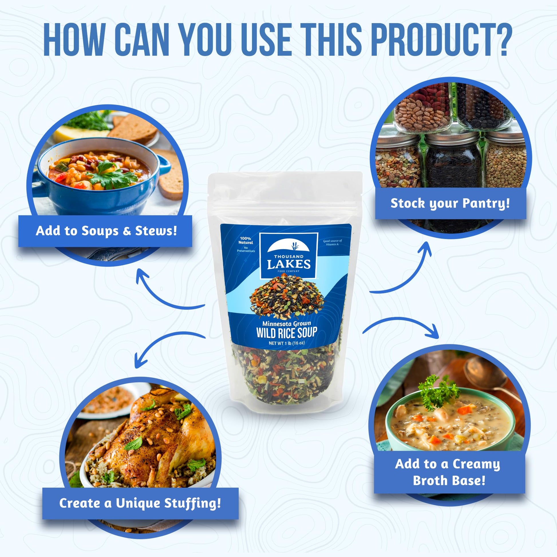 This Minnesota Wild Rice And Vegetable Dry Soup Mix Is Fat Free And Made With Our Famous Minnesota-Grown Premium Grade Wild Rice, Organic Barley, And 11 Dried Vegetables.