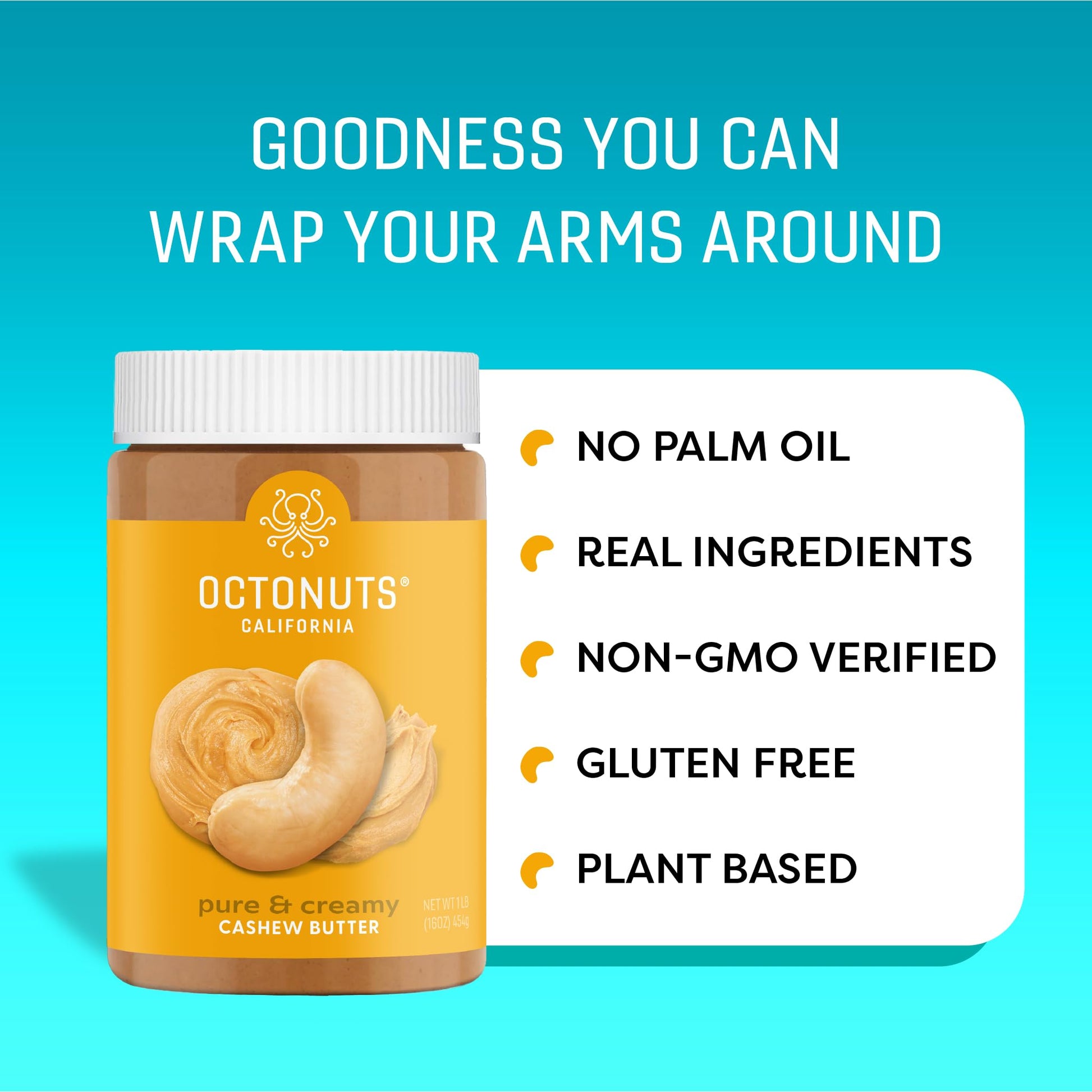 • Q: What are the main ingredients in Octonuts Dry Roasted Pure Cashew Butter? A: Octonuts Dry Roasted Pure Cashew Butter is made from single ingredient cashews, which are dry roasted to enhance their flavor without added oils or saturated fats.