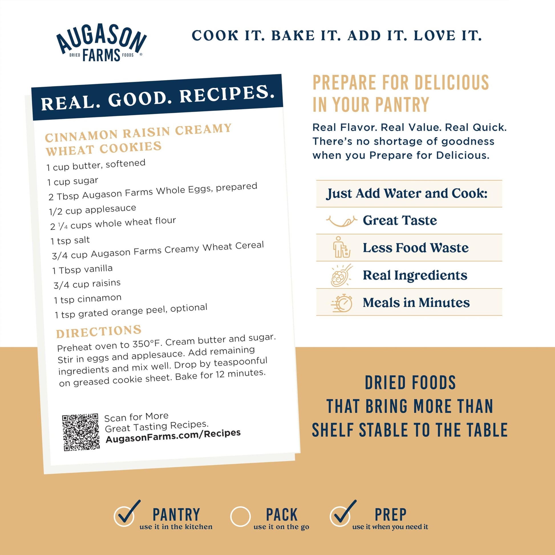 - Q: What is Augason Farms Creamy Wheat Cereal and how can it be used? A: Augason Farms Creamy Wheat Cereal is a versatile breakfast food that can be enjoyed in various ways. You can serve it as a warm cereal topped with nuts, honey, or freeze-dried fruits like blueberries and strawberries. Additionally, it can be incorporated into recipes such as cookies or used as a thickener in other dishes.
