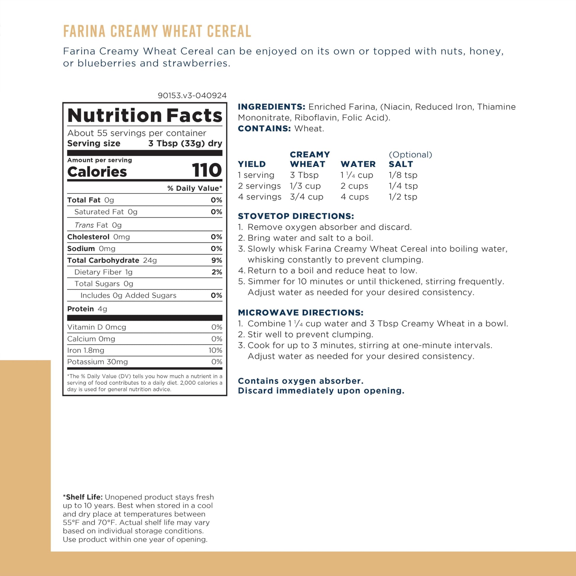 - Q: How long does the shelf life of Augason Farms Creamy Wheat Cereal last? A: The shelf life of Augason Farms Creamy Wheat Cereal is up to 10 years when unopened and stored properly in a cool, dry place at temperatures between 55°F and 70°F. Actual shelf life may vary based on individual storage conditions.