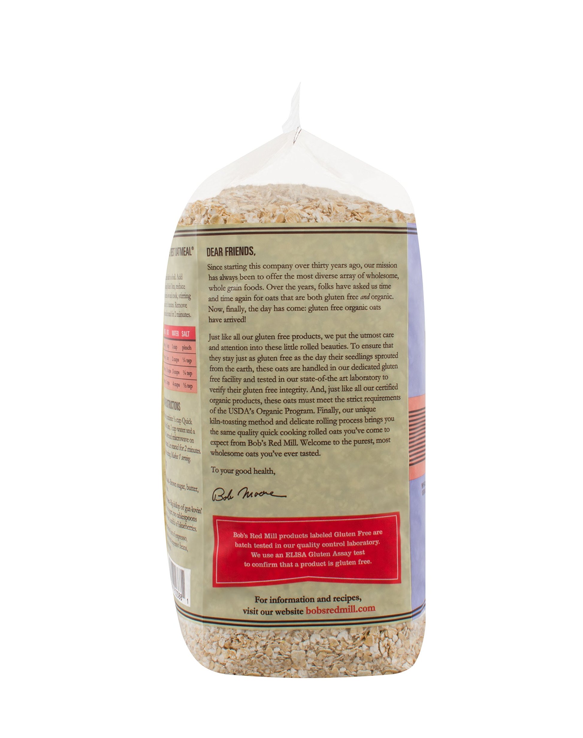 Bob's Red Mill Gluten Free Organic Quick Cooking Rolled Oats are classic whole grains. To create these oats, we cut the groats in smaller pieces, so they cook in as few as 7 minutes. They can make a deliciously satisfying hot cereal for breakfast or a hearty loaf of bread with lunch or dinner. Whatever the form, these oats are an excellent source of protein and dietary fiber. Delicious, nutritious and eaten for generations. Go ahead, treat yourself to a bag of Bob's Red Mill Gluten Free Organic Quick Cooking Rolled Oats.