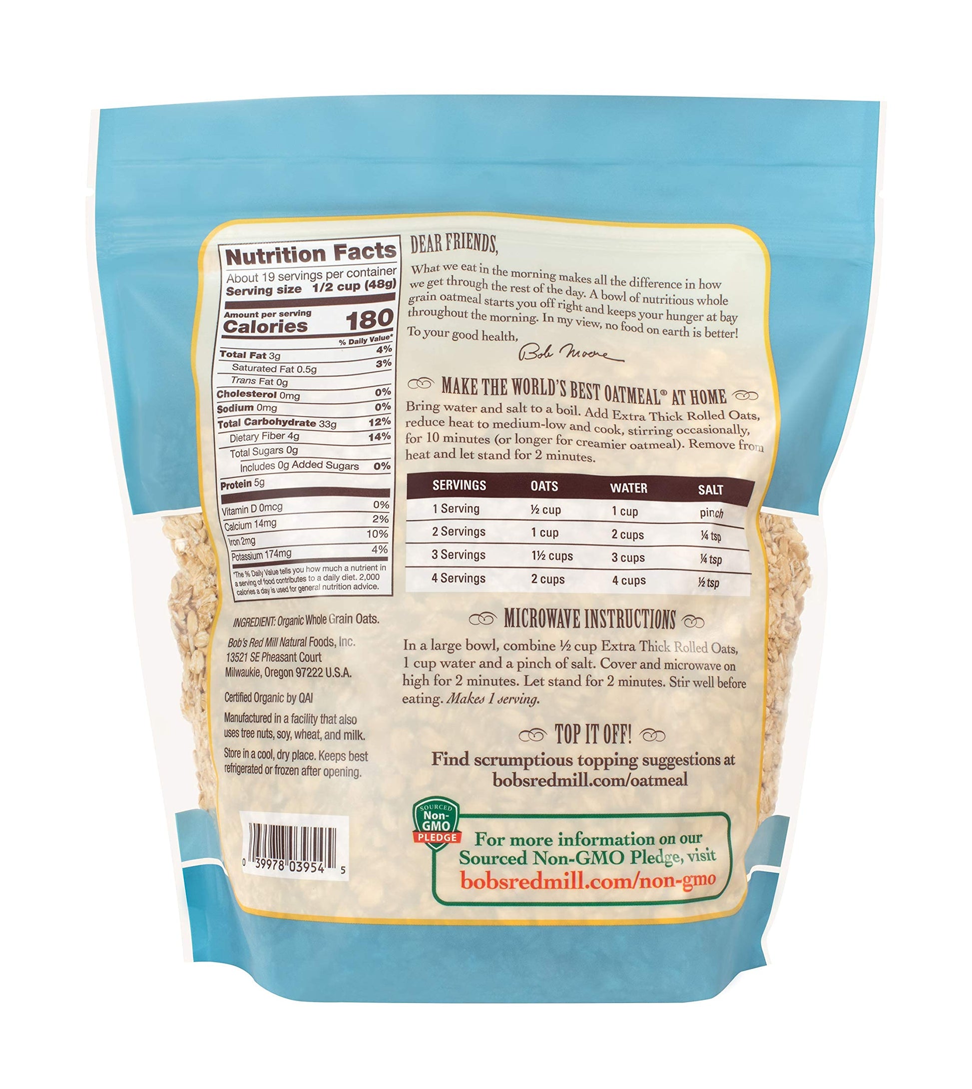 - Q: What is the recommended serving size for Bob's Red Mill Organic Extra Thick Rolled Oats? A: The recommended serving size for Bob's Red Mill Organic Extra Thick Rolled Oats is 1/2 cup dry, which typically yields about 1 cup of cooked oatmeal. This serving provides a nutritious start to your day!