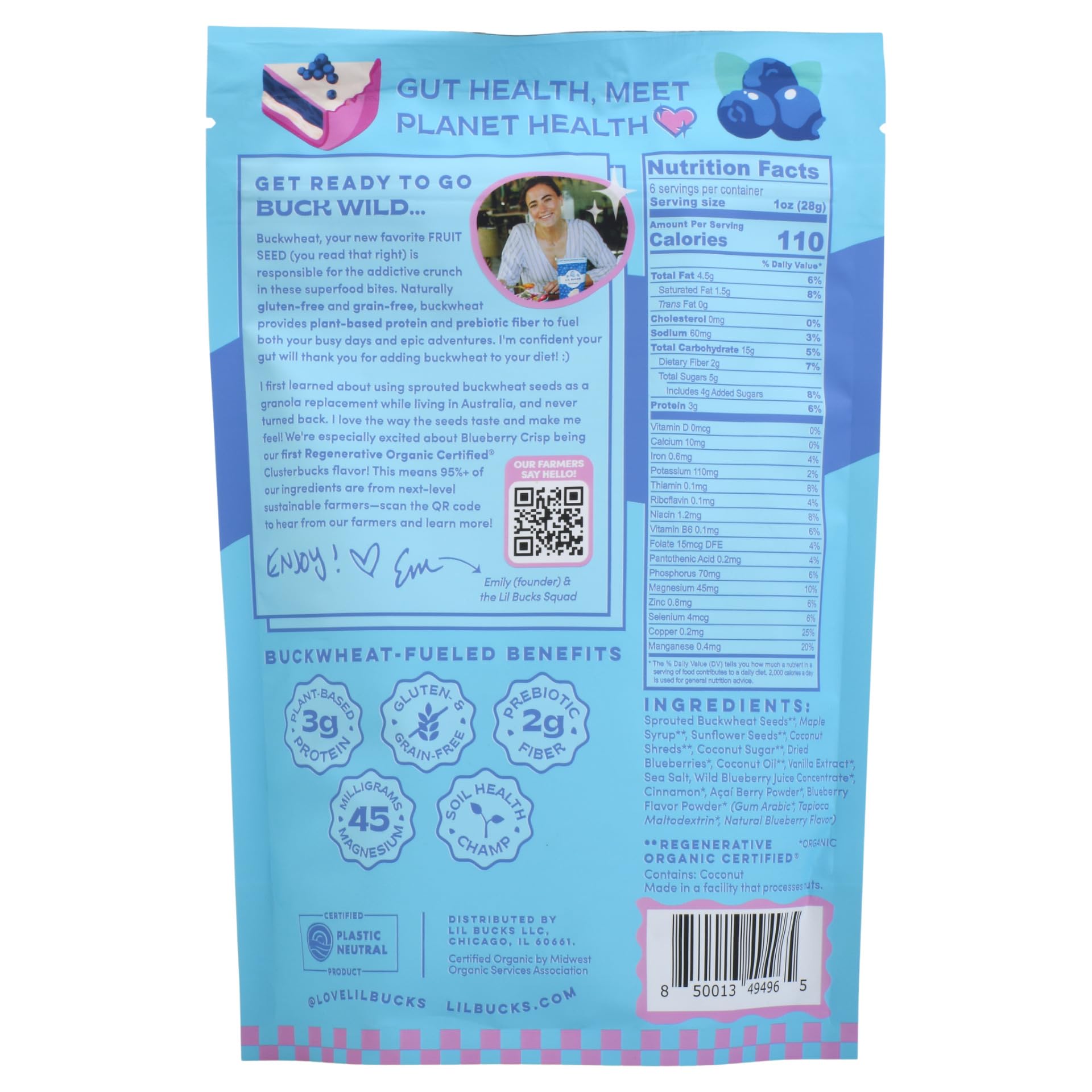 Granola, Meet Your Match. Lil Bucks Clusterbucks Give You The Satisfying Crunch You Crave And Are Grain-Free, Organic, Paleo, Vegan And More (Your Move, Granola)! Explore Flavors Like Blueberry Crisp, Chocolate Sea Salt, Bucks N Honey, Birthday Cake, And Coconut Maple. At Lil Bucks, Sustainability Is Essential. Thats Why We Use Plastic Neutral Packaging. Even Our Buckwheat Gives Back, Adding Nutrients To Soil, Even In Colder Climates! Take Your Snacking To The Next Level And Promote Sustainable Farming With Crunchy Lil Bucks Clusterbucks.