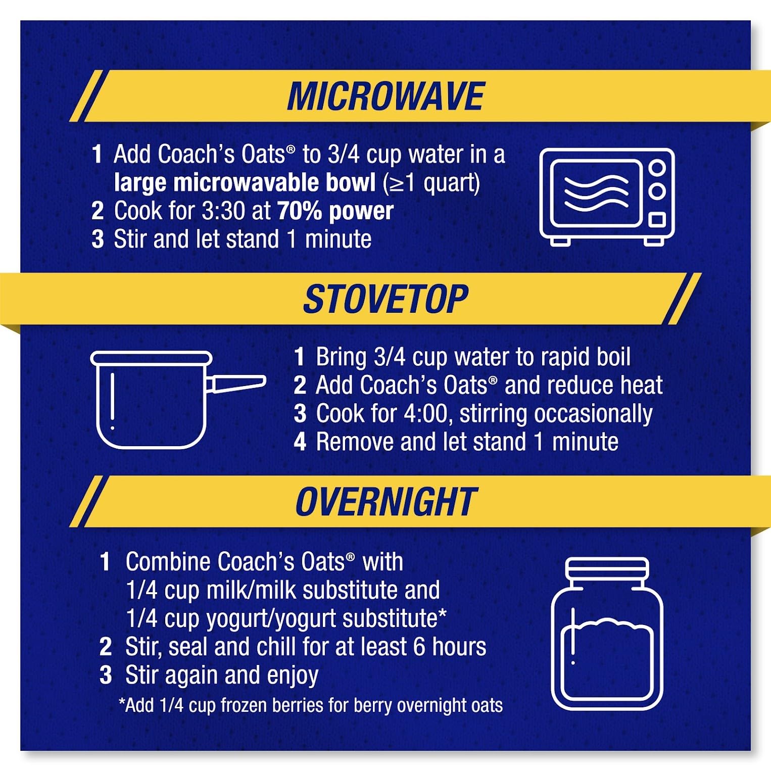 Q: How do I prepare Coach's Oats?A: Preparing Coach's Oats is simple. You can cook it on the stovetop or in the microwave. Just add water to a pot or bowl, mix in Coach's Oats, and cook for 3 to 5 minutes for a nourishing breakfast.