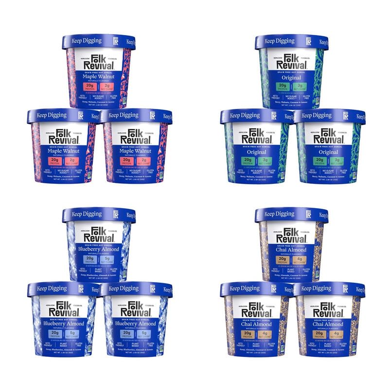 - Q: What ingredients are used in the various flavors of Folk Revival Keto Instant Oatmeal? A: Folk Revival Keto Instant Oatmeal is made from wholesome ingredients. The Original flavor contains hemp protein powder, acorn flour, and seeds, while the Blueberry Almond includes wild blueberries, and the Chai Almond features chai spice flavor. All flavors are crafted with natural ingredients to provide essential nutrition.