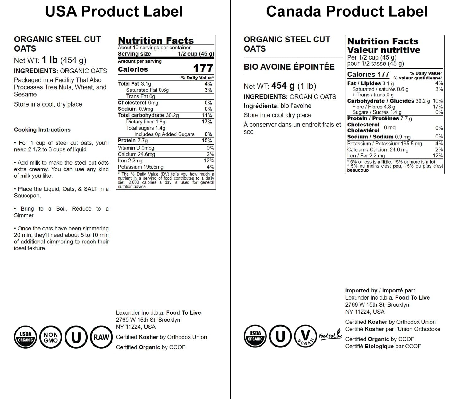 Organic Steel Cut Oats from Food to Live is made from certified organic whole oat grains, after cleaning them by crushing into small pieces. In this way, Organic Steel Cut Oats are more convenient for cooking various dishes while retaining all the benefits of whole grains. Nutritional Value Organic Steel Cut Oats are such a fantastic grain because they are highly nutritious. This product is rich in calcium. Other essential minerals you can get from Organic Steel Cut Oats are: * Phosphorus * Iron * Copper * Zinc Organic Steel Cut Oats are rather filling and high in dietary fiber Organic Steel Cut Oats definitely make one of the healthiest grain choices. As they taste great in savory and sweet dishes, it'll be easy to add them to your diet. If you are on a weight management plan, choosing Organic Steel Cut Oats for one of the daily grain servings will boost your energy. Complex carbs and fiber digest gradually, which means you'll feel full longer, preventing hunger pangs. How to Cook Organic Steel Cut Oats? The easiest recipe: Pour 4 servings of water into the pan, add salt to your own taste and bring the water to a boil. Then add 1 serving of Organic Steel Cut Oats to in boiling water and mix the porridge well. Cook Organic Steel Cut Oats at low temperature stirring constantly for 30 minutes. Your Organic Steel Cut Oats oatmeal is ready! You can add fruits, nuts, cream, milk, various syrups to diversify your oatmeal breakfast. Organic Steel Cut Oats: Storage Tips Organic Steel Cut Oats don't require special storage conditions. Keep them dry and safe in an airtight container. Store your oats away from direct sunlight and heat. Refrigerating and freezing increases product's shelf life.
