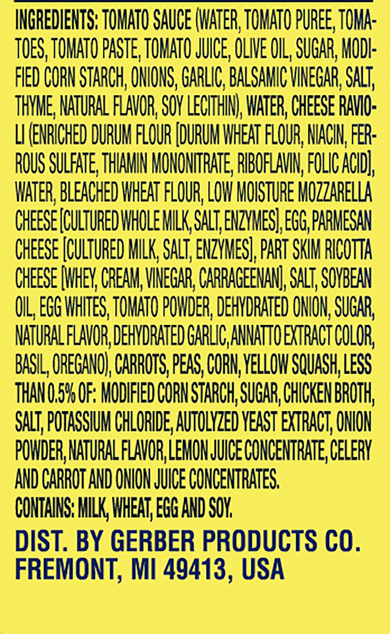 Q: Are there any allergens in Gerber Graduates Cheese Ravioli?A: While the specific allergens are not listed, it is important to check the packaging for any potential allergens, especially for toddlers with food sensitivities or allergies.