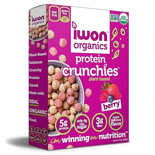 Q: What are the main ingredients in IWON Organics Protein Crunchies?A: IWON Organics Protein Crunchies are made with real organic food ingredients, including yellow peas, beans, and brown rice. This combination provides a nutritious and delicious breakfast option.