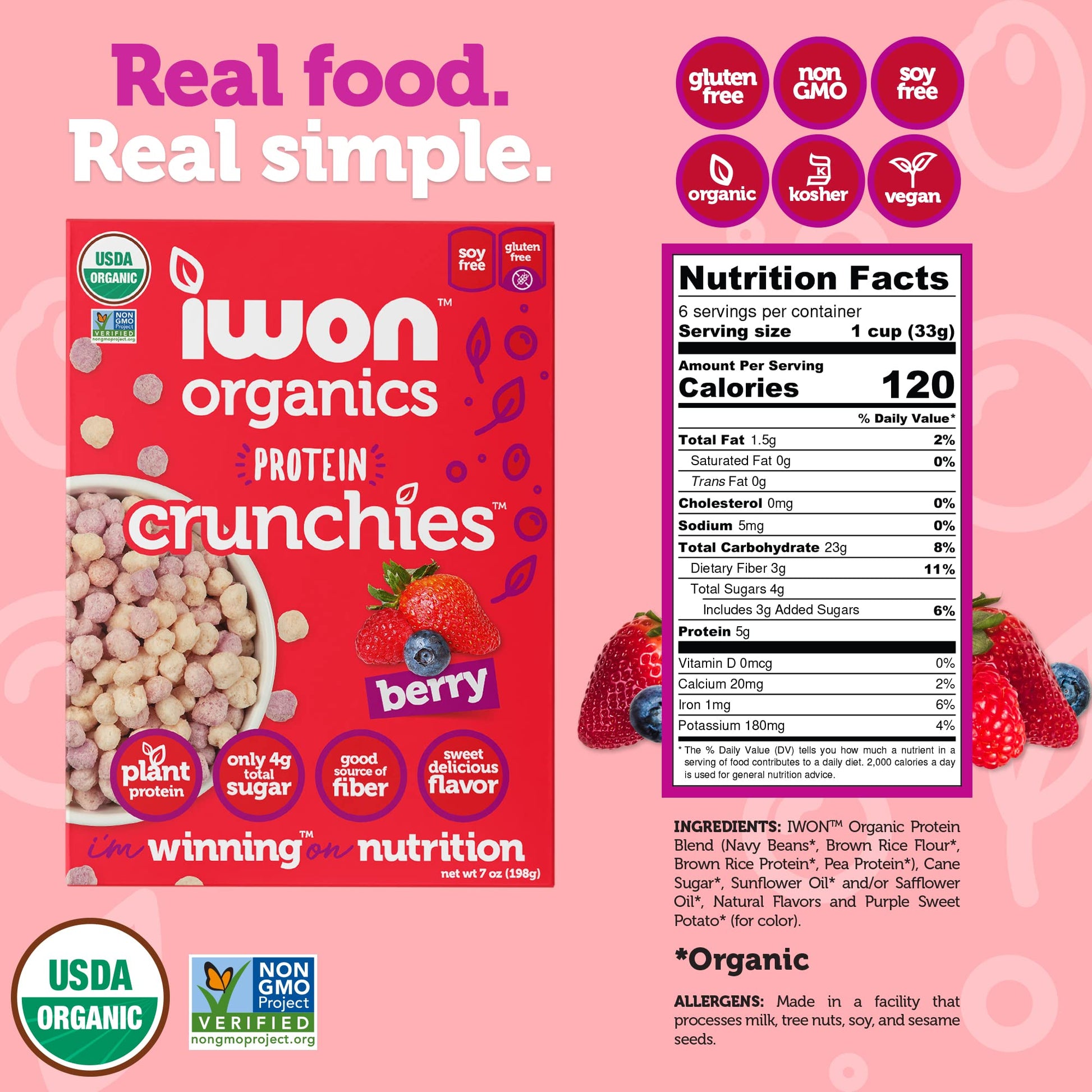 Berry cereal with a fruity touch and none of the bad stuff. IWONAs New Protein crunchies take flavor and nutrition to a whole new level. Made with REAL organic food. Non-gMO, 5g of protein and 3g of fiber per serving plus a sweet delicious taste with only 4g of sugar