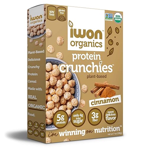 Q: What ingredients are in IWON Organics Protein Crunchies?A: IWON Organics Protein Crunchies are made with real organic food ingredients, including yellow peas, beans, and brown rice. This ensures a nutritious and wholesome breakfast cereal option.