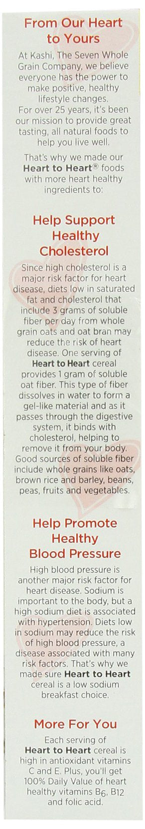 - Q: How does Kashi support heart health with this cereal? A: Kashi Heart to Heart Cereal supports heart health by including ingredients like oats which provide soluble fiber, essential vitamins, and low sodium. Each serving contains one gram of soluble fiber that may help maintain healthy cholesterol levels.
