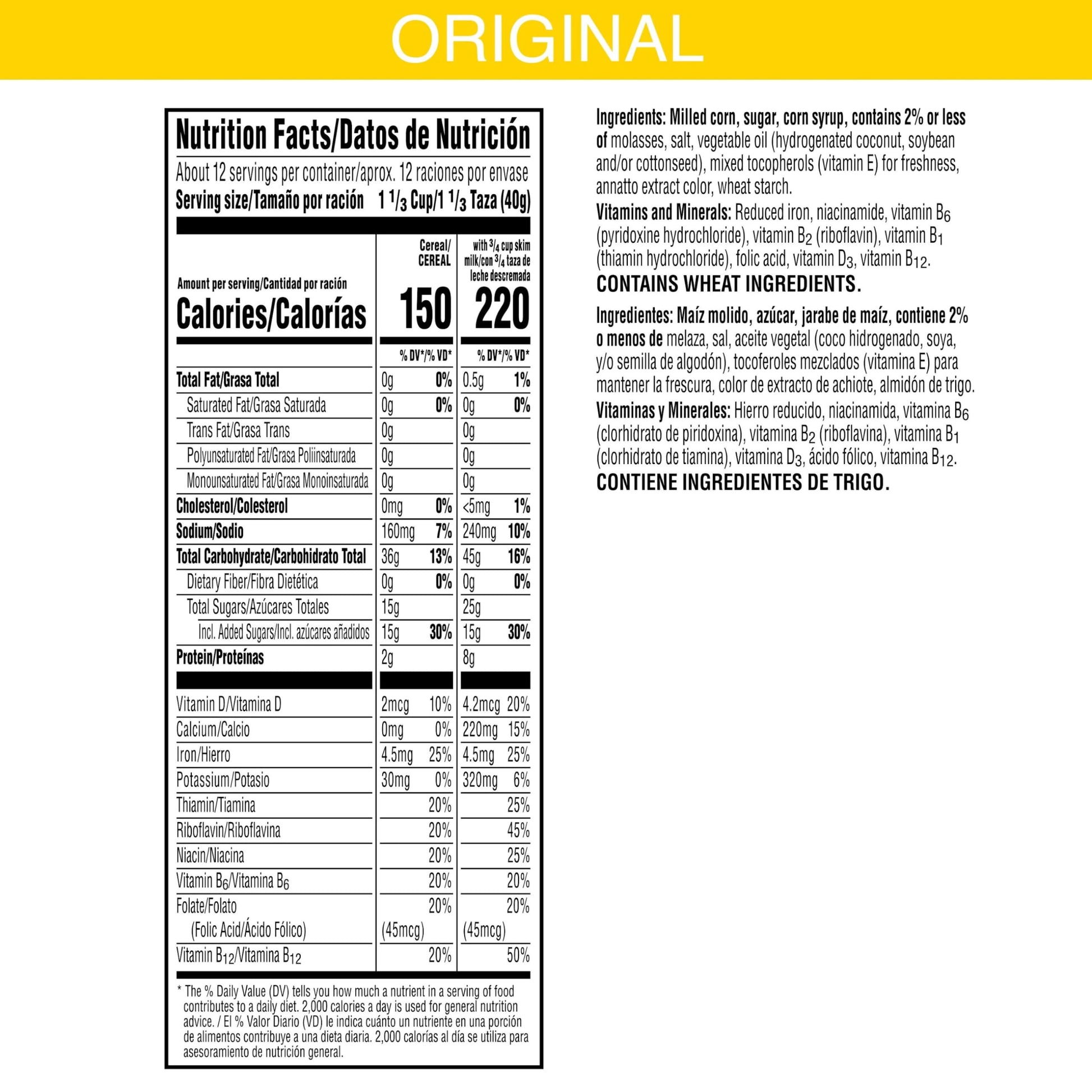 Q: What are the main ingredients in Kellogg's Corn Pops?A: Kellogg's Corn Pops primarily contain popped corn as the first ingredient, along with sugars and a good source of 8 vitamins and minerals. The cereal is made with colors and flavors from natural sources.