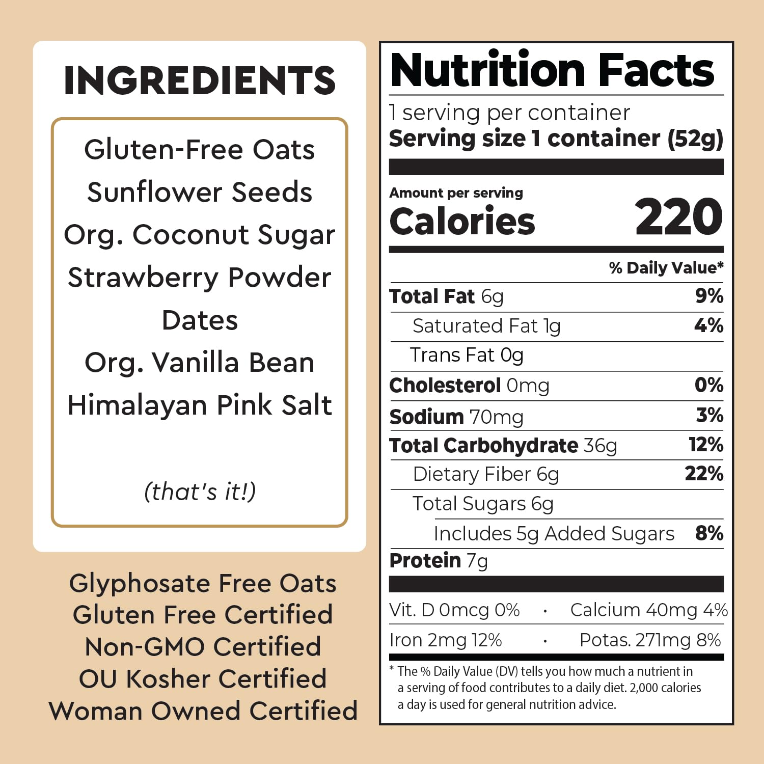 - Q: What ingredients are in Mylk Labs Maple Strawberry Protein Oatmeal Cups? A: Mylk Labs Maple Strawberry Protein Oatmeal Cups are made with gluten-free oats, sunflower seeds, pure maple syrup, strawberry powder, and lightly seasoned with Himalayan pink salt. Each cup features wholesome ingredients that are non-GMO, vegan, and nut-free.