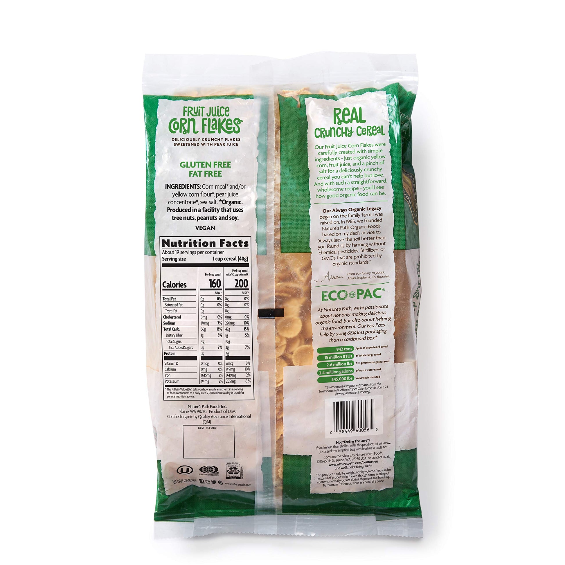 Details:br NATURE'S PATH CEREAL, FRUIT JUICE SWEETENED CORN FLAKES IS A GLUTEN-FREE CERTIFIED CEREAL MADE OF CORN AND SWEETENED WITH FRUIT JUICE. WE CREATE OUR CEREAL USING KOSHER, NON-GMO AND USDA ORGANIC CERTIFIED GRAINS AND IT IS ENTIRELY FREE OF WHEAT. THE PRODUCT INCLUDES ONE 26.4 OZ. BAG. SEE NUTRITION FACTS PANEL FOR ALLERGENS.pIngredients: CORN MEAL* ANDOR YELLOW CORN FLOUR;PEAR JUICE CONCENTRATE;SEA SALTp