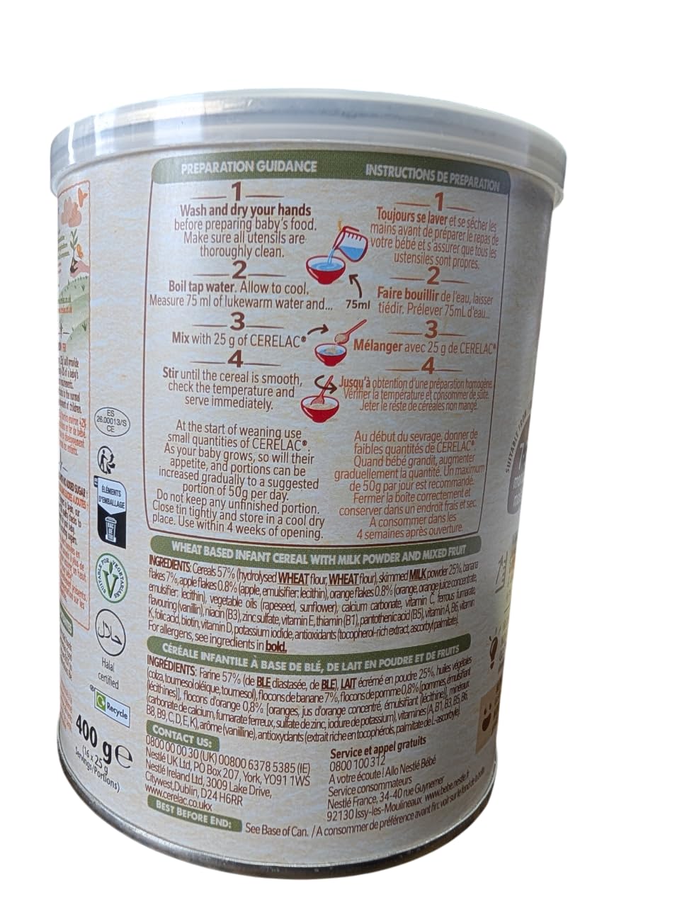 Q: Is Nestle Cerelac suitable for babies with allergies?A: Nestle Cerelac contains wheat and milk powder, so it may not be suitable for infants with allergies to gluten or dairy. Always consult with a pediatrician before introducing new foods.