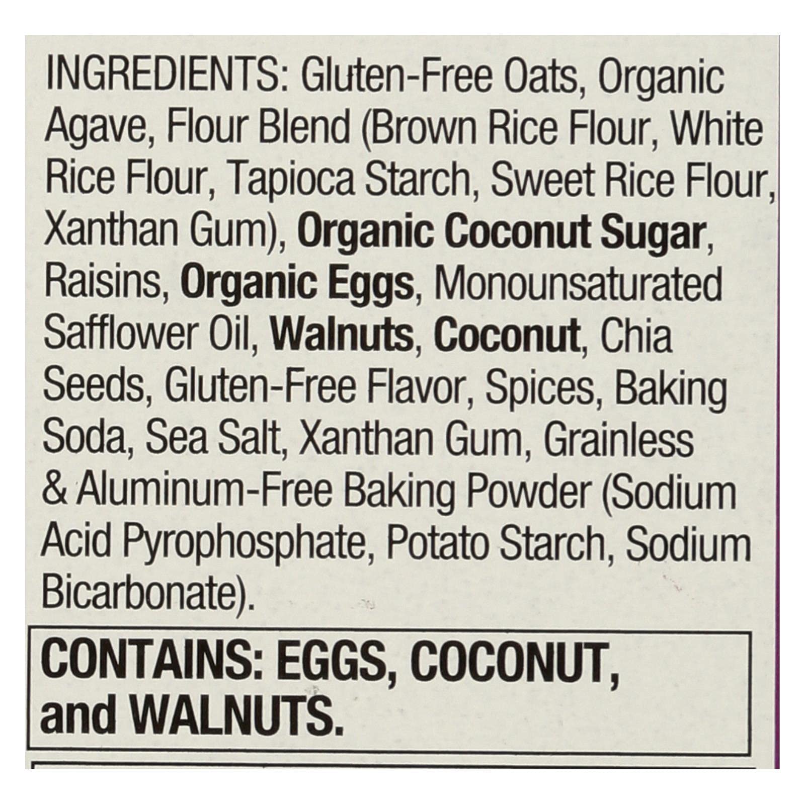 Q: What are the main ingredients in Pamela's Oat Raisin Walnut Spice Bars?A: Pamela's Oat Raisin Walnut Spice Bars are made with gluten-free oats, chia seeds, and sweetened lightly with agave and coconut sugar, providing a wholesome and delicious snack.