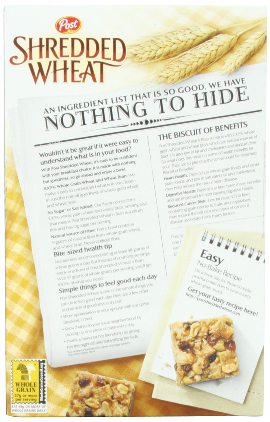 Q: What are the main ingredients in Post Shredded Wheat 'N Bran cereal?A: Post Shredded Wheat 'N Bran cereal is made with 100% natural whole-grain wheat and bran, providing a delicious and nutritious breakfast option.