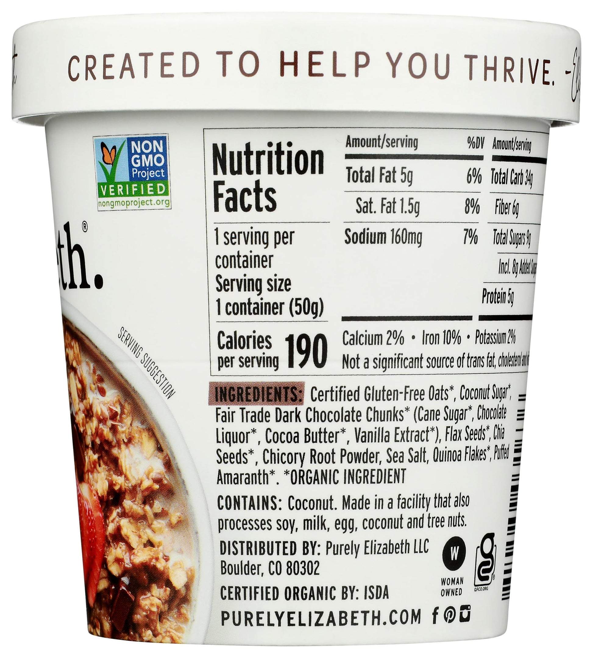 Q: What are the main ingredients in Purely Elizabeth Oatmeal Cup Dk Choc Chunk?A: Purely Elizabeth Oatmeal Cup Dk Choc Chunk primarily contains oats, dark chocolate chunks, and other wholesome ingredients designed for a nutritious breakfast option.